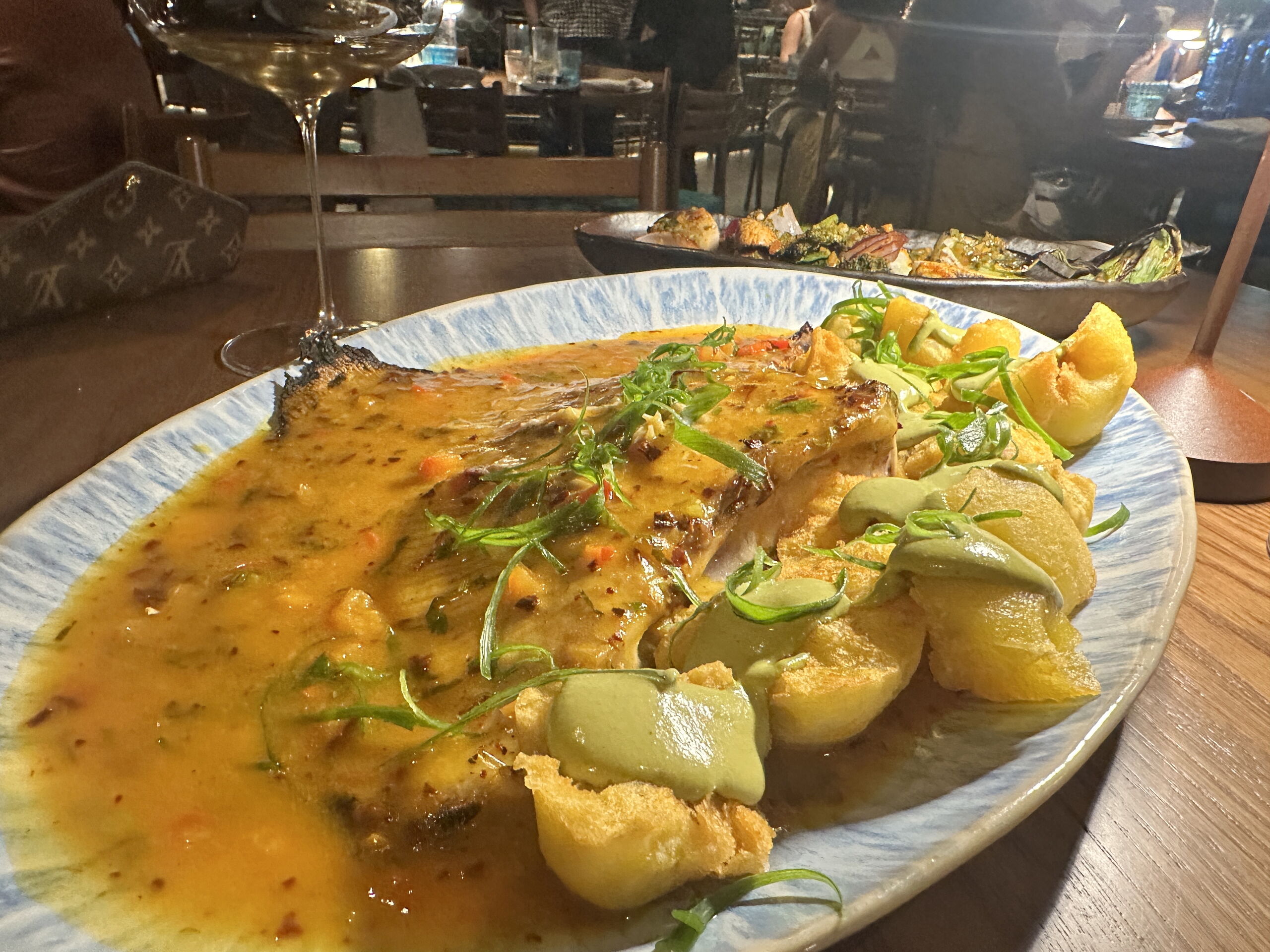 Terminamos este viaje por el Perú con el Pescado Entero (para dos). En este caso el ala de raya (58 €), un pescado traído de Cádiz con una salsa de ajillo limeño, papas amarillas peruanas y salsa ocopa, elaborada con huacatay, ají limo, ají panca, ají amarillo, rocoto y leche de tigre. Un pescado fresco, pasado por las brasas y bañado en una salsa que lo ensalza gracias a esa mezcla de ajís que le dan un frescor y toque picante especial. Lo acompañamos con verduras a la brasa para redondear el plato.