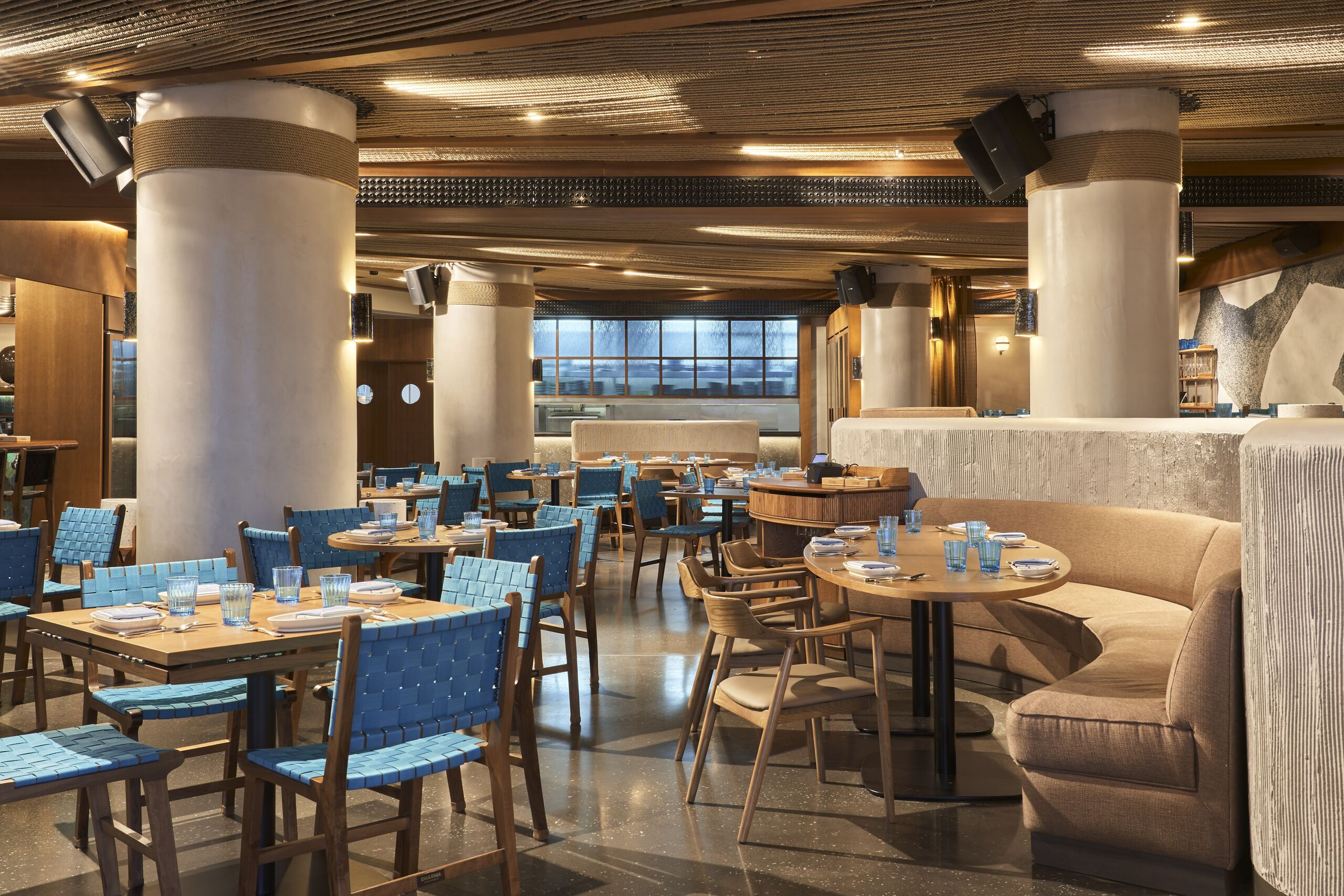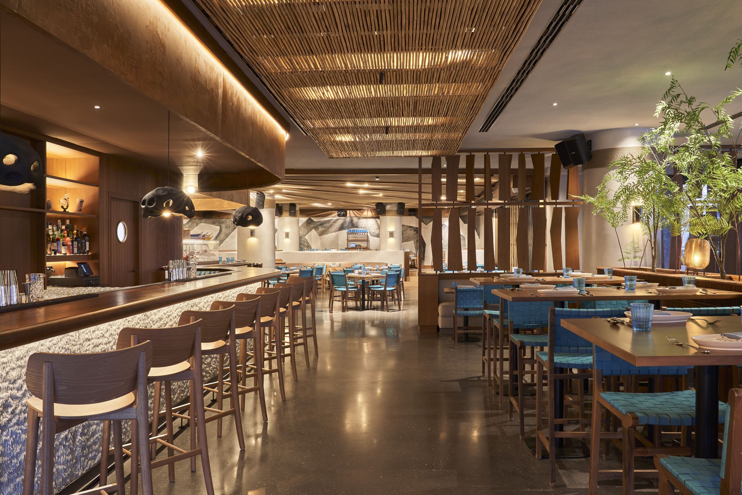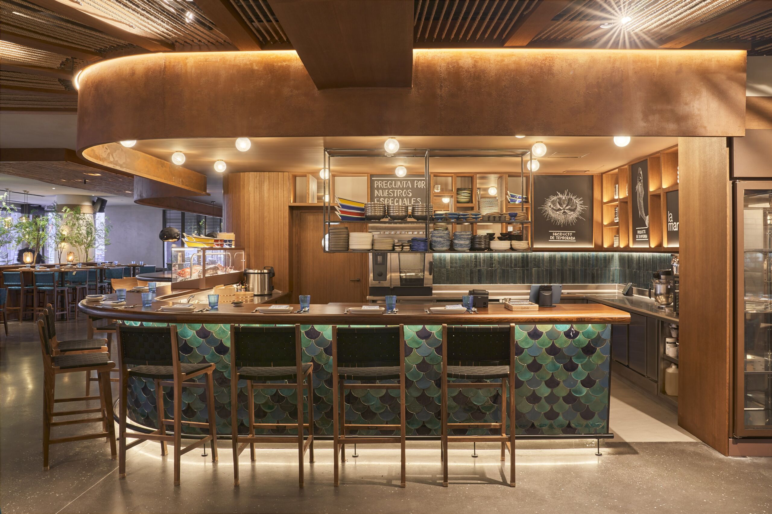Los tonos turquesa dominan el ambiente, combinados con madera de mongoi y bambú. La barra principal, de piedra labrada, evoca la erosión marina, mientras que la barra de ceviches, revestida con mosaicos azul verdosos, recuerda las escamas de los peces.