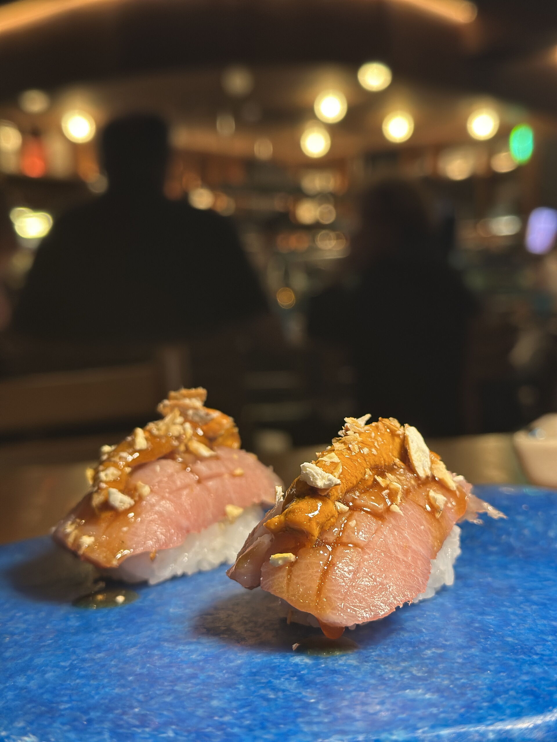 Así que empezamos con dos bocados de influencia japonesa como la formidable ostra nikkei (7 € unidad) con ponzu de rocoto ahumado y chalaquita amazónica, un aderezo que deja expresarse con todo su sabor al marisco aportandole ese toque ahumado, cítrico y picante. Delicioso también el niguiri de ventresca con erizo (12 €) en el que se aprecia la calidad del producto y la mezcla de sabores del atún con ese caviar con tanto umami.