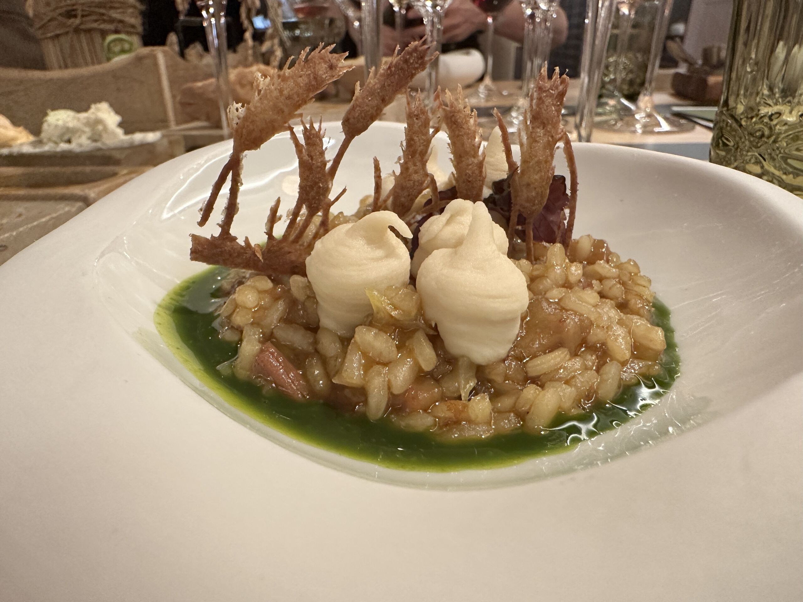 codium; con sabor el mochi de espárrago verde y muy sabroso el arroz de jamón ibérico, crema de col y hierbas anisadas con emulsión de alubias y espiga de arroz crujiente.