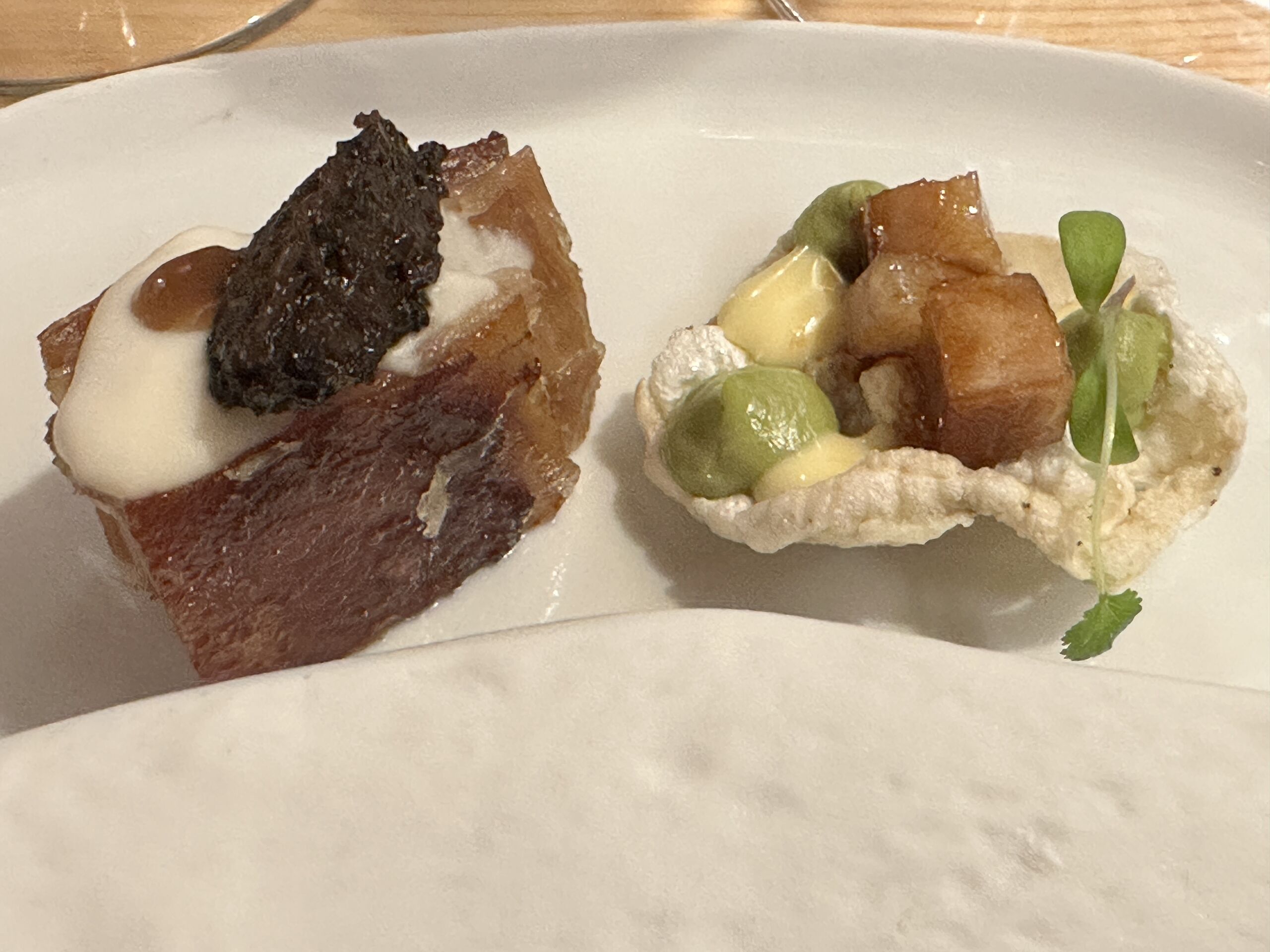 Como del cerdo se come todo, probamos una maravillosa coca crujiente de manitas y oreja de cerdo, papada a baja temperatura y tomillo. Espectacular el sándwich de ventresca de cochinillo, duxelle de setas y crema de queso Perfecto. Y para enmarcar el mar y montaña del suquet de manitas de cerdo, butifarra negra y espardeñas, con un fondo de los que permanecen en la memoria.
