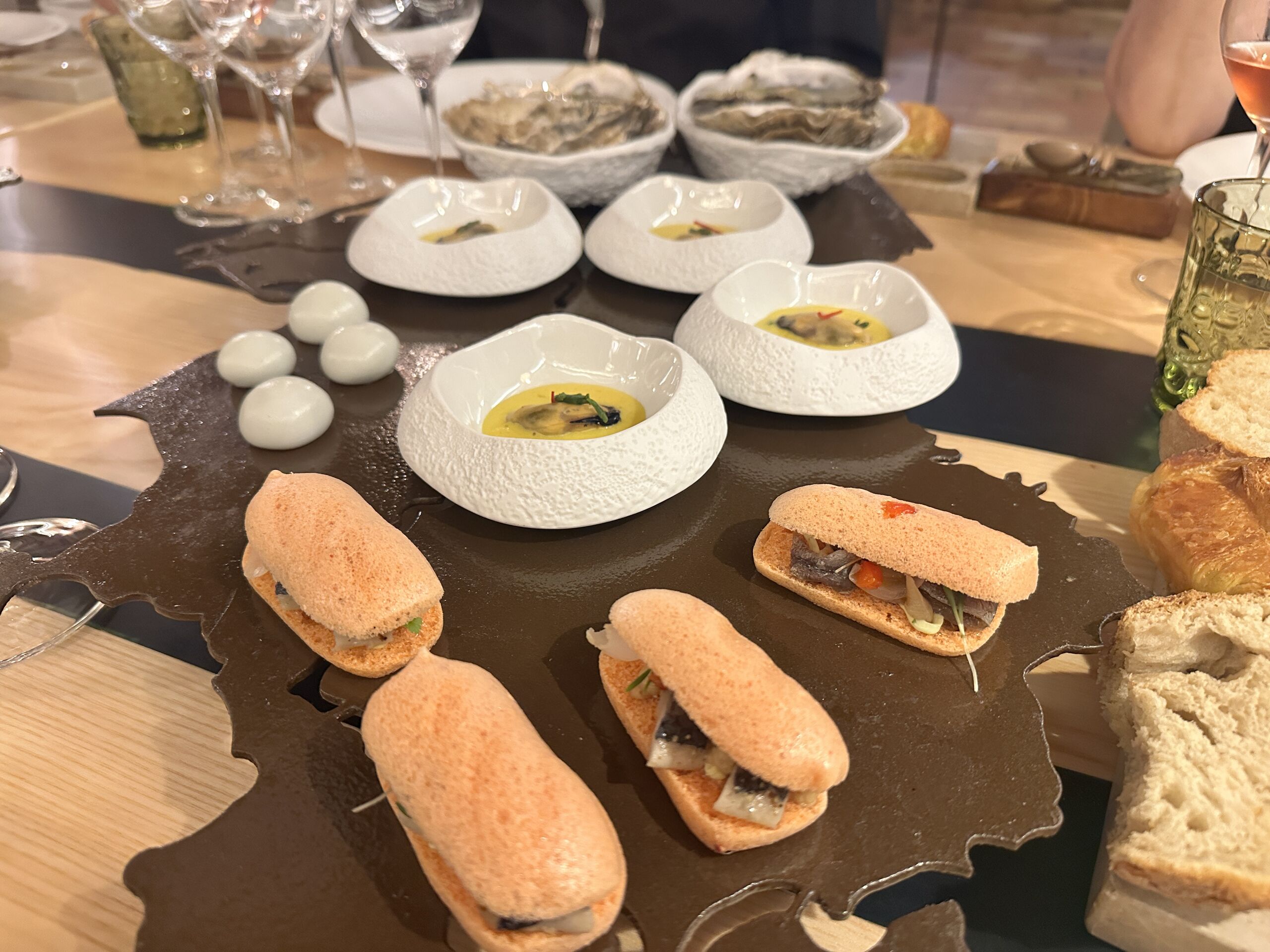 Con esa declaración de principios nos sentamos en la mesa del restaurante para degustar su Menú Homenaje que comienza con unos aperitivos en los que nos dan la bienvenida y que están presentados sobre un mapa que represanta las cuatro comarcas de las Tierras del Ebro. Un muy buen comienzo, sobre todo con la crema de mejillón del Delta, azafrán, jengibre y salicornia y la ostra con toques cítricos.