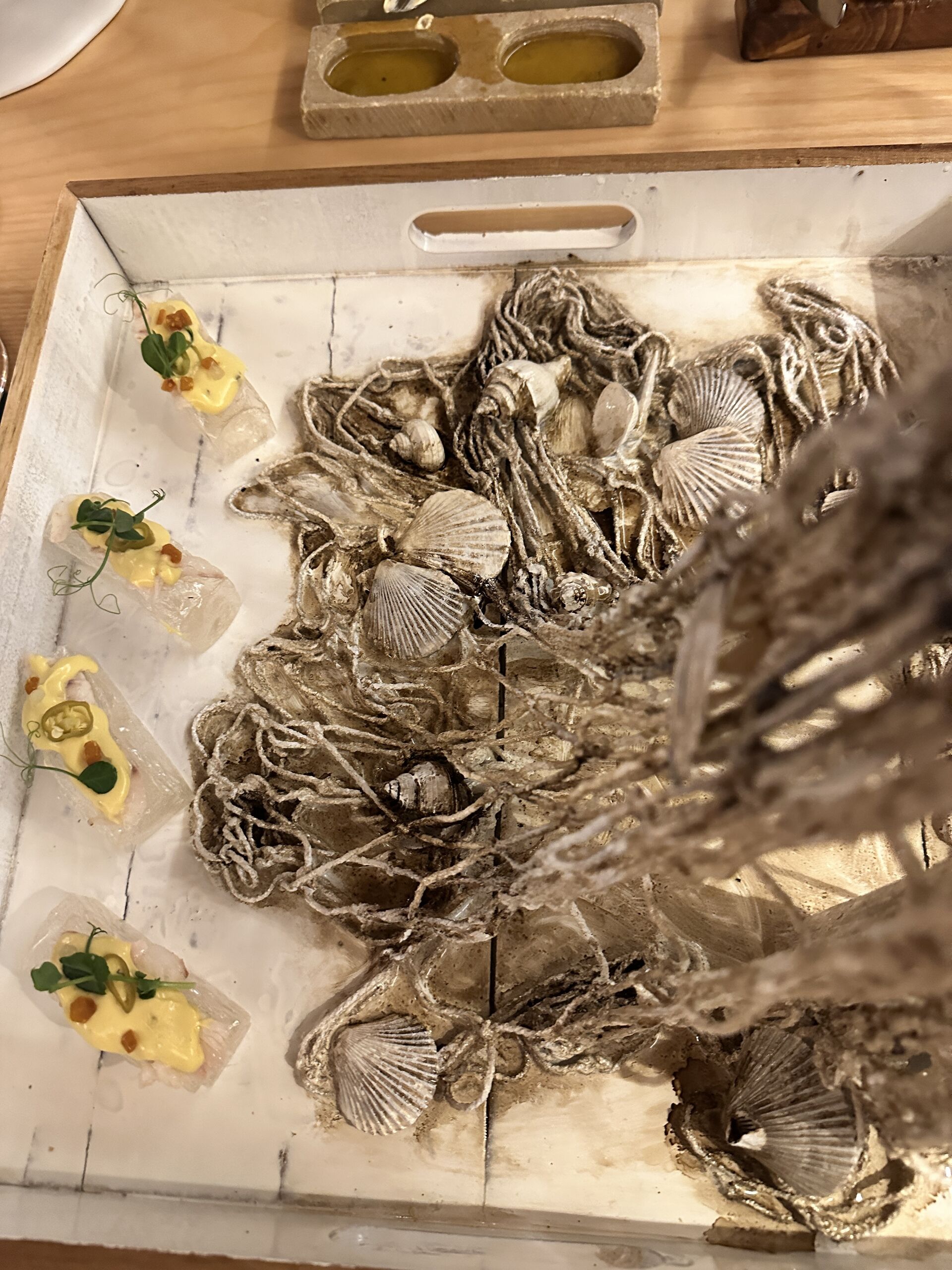 Hablaba el chef Fran López en su presentación del menú de las técnicas de pesca centenerarias, lo que comprobamos en el cuarto pase de "La pesca al rall y la paupa". El rall es una red que se lanza con destreza al agua para capturar los peces, y la pesca "a la paupa" consiste en utilizar las manos para buscar peces u otros animales marinos.