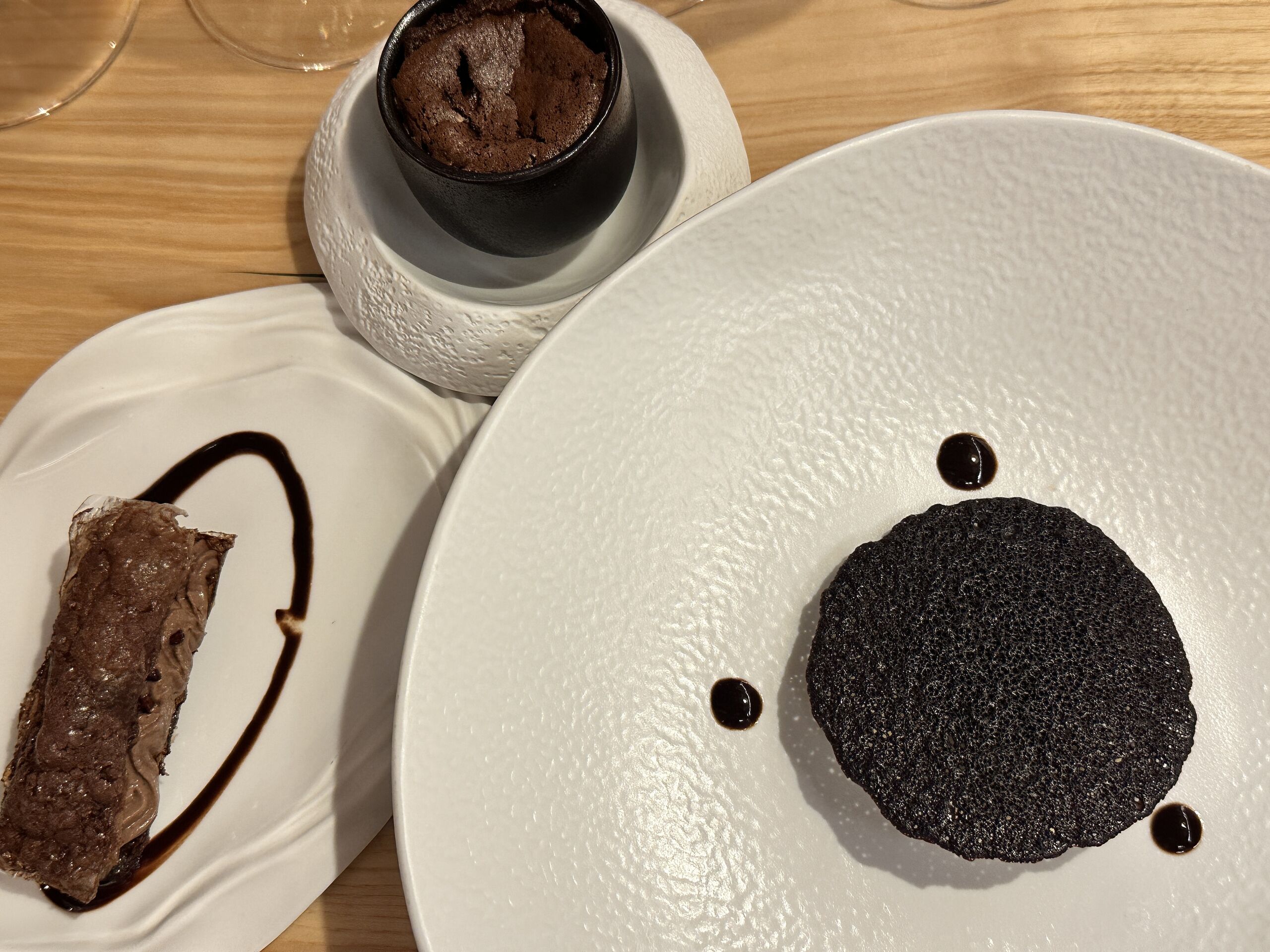 Y de tradiciones, el arroplegar, que consiste en recoger las aceitunas que quedaban en el suelo después de la cosecha para consumo propio, ya sea para elaboración de aceite como para su conservación. Y de ahí viene el postre, un milhojas de algarrobo y chocolate Creo, aceituna kalamata, aceite de oliva virgen extra y sal de las Salinas del Delta; y un soufflé de algarroba, crema de vainilla y cacao.