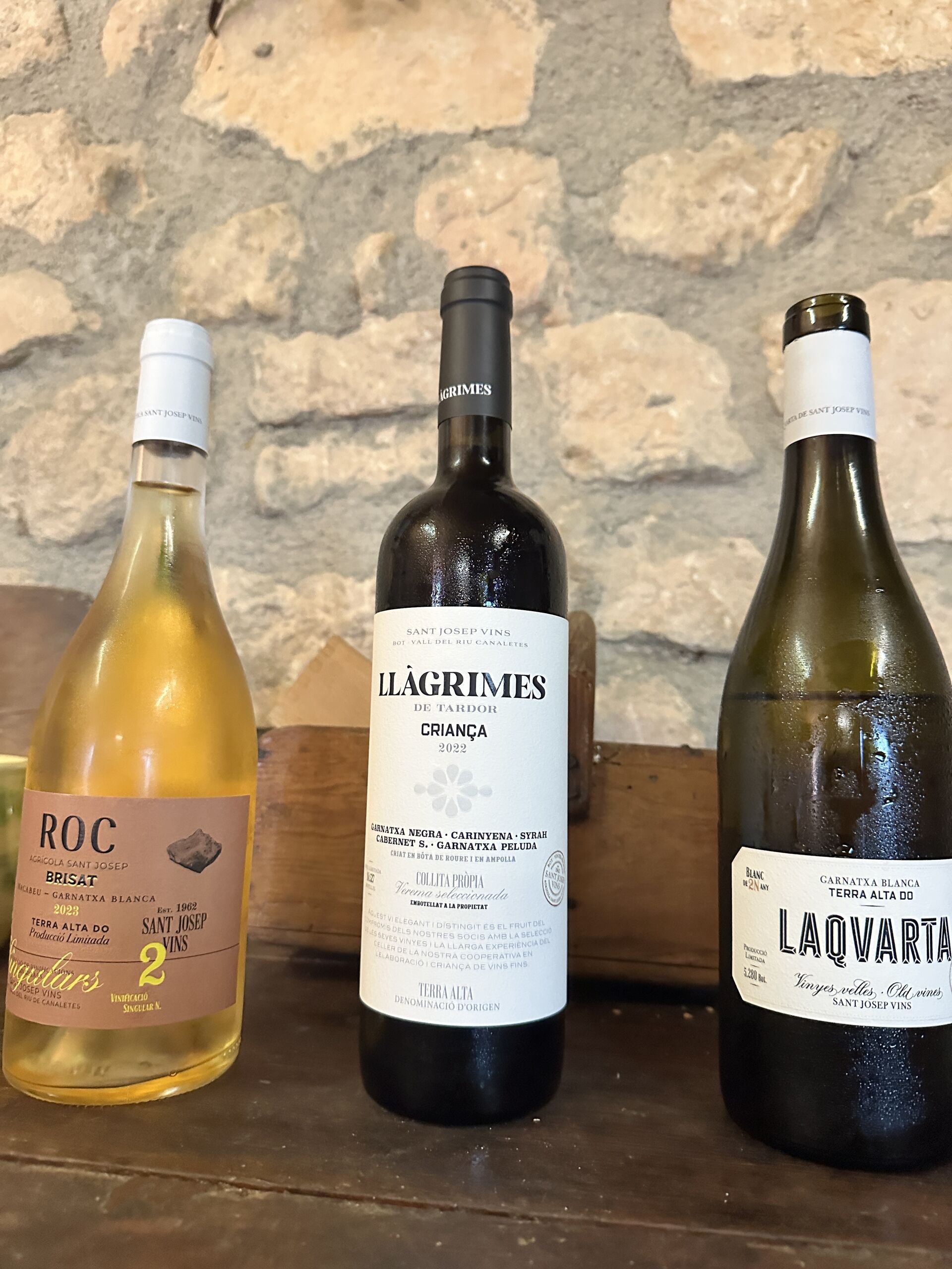 Durante la cata que hicimos tras la visita a una de los viñedos probamos Plana d’en Fonoll, un vino blanco de variedades Sauvignon blanc y Moscatel. Un Roc Singulars Brisat, elaborado a partir de viñas seleccionadas de Viura y Garnacha blanca. El vino tinto corrió a cargo de Llàgrimes de tardor, uno de los primeros tintos DO Terra Alta en fusionar variedades tradicionales y largo envejecimiento. Y terminamos con Laquarta, elaborado con Garnacha blanca.