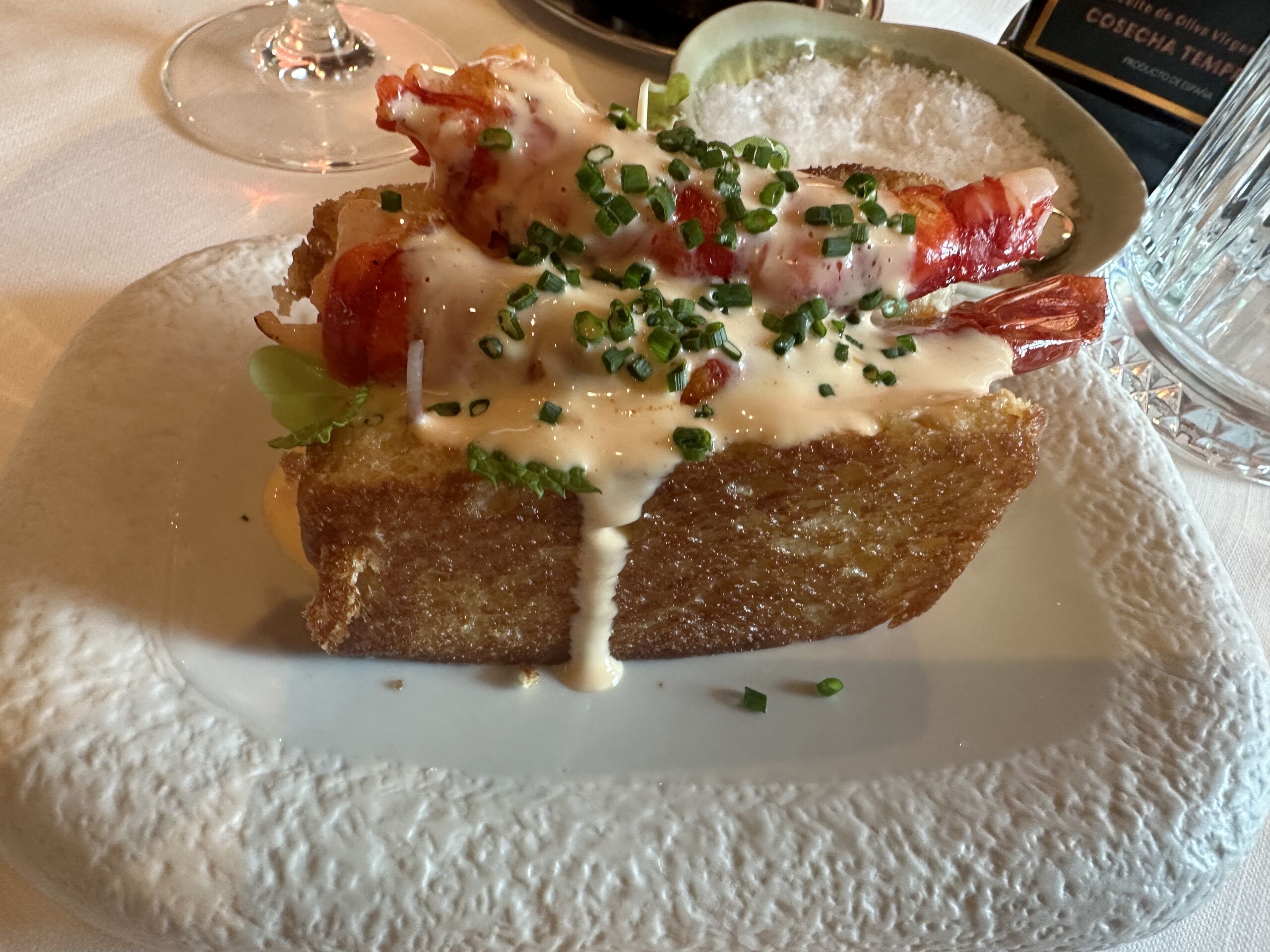 También tienes de entrante el dúo de gyozas —de callos de buey y rabo de buey—, o las croquetas de cecina de buey, y tanto el bombón de txangurro como las anchoas del Cantábrico sobre pan de cristal con tomate que ya probé en mi anterior visita a Rocacho de Marqués de Salamanca y que te conté en Libertad Digital.