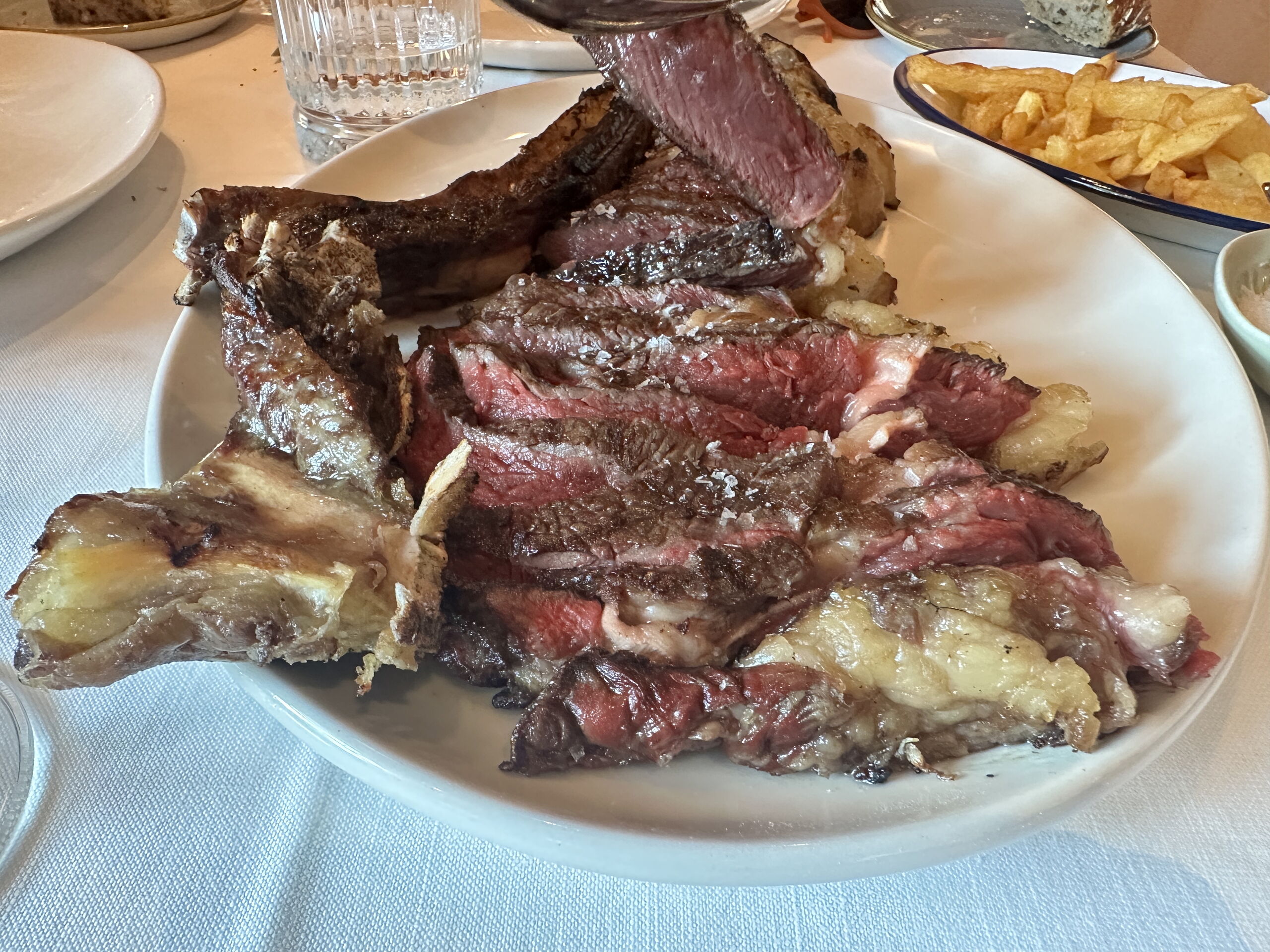 Como te conté antes, la pieza de carne llegó a la mesa una vez hecha la comanda y seleccionada por el personal para deleite del comensal, presentada en una caja de madera con su etiqueta, en este caso de chuleta de vaca Frisona (85 € kg), de maduración media de 40 días. Después de probar la carta, llega el momento esperado de degustar esta carne antológica preparada en la parrilla de carbón de encina que tanto domina su chef Jairo Soria para que estos excelentes cortes lleguen a la mesa en su punto perfecto. Viene, además acompañada por unas deliciosas patatas fritas y unos pimientos asados de categoría.