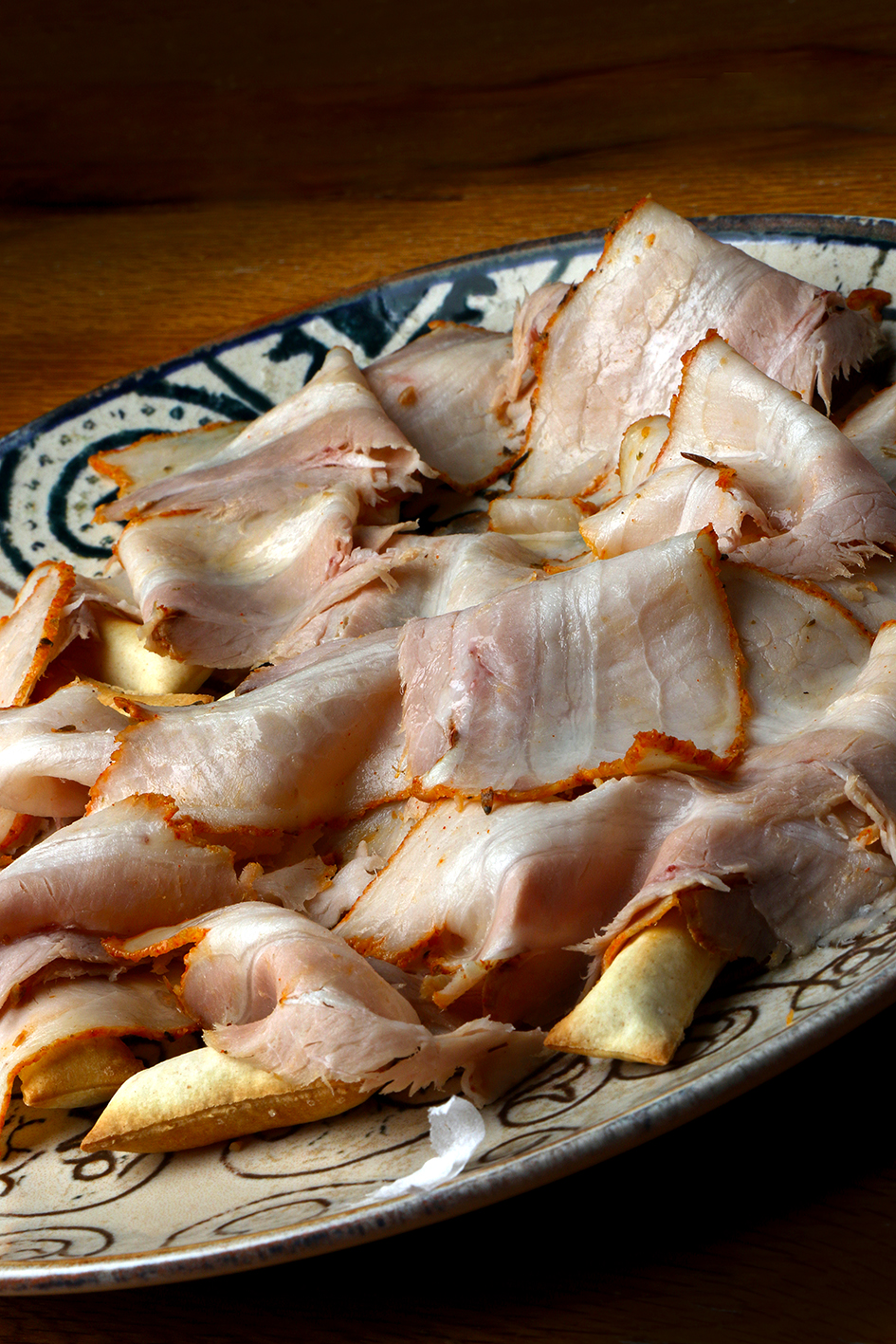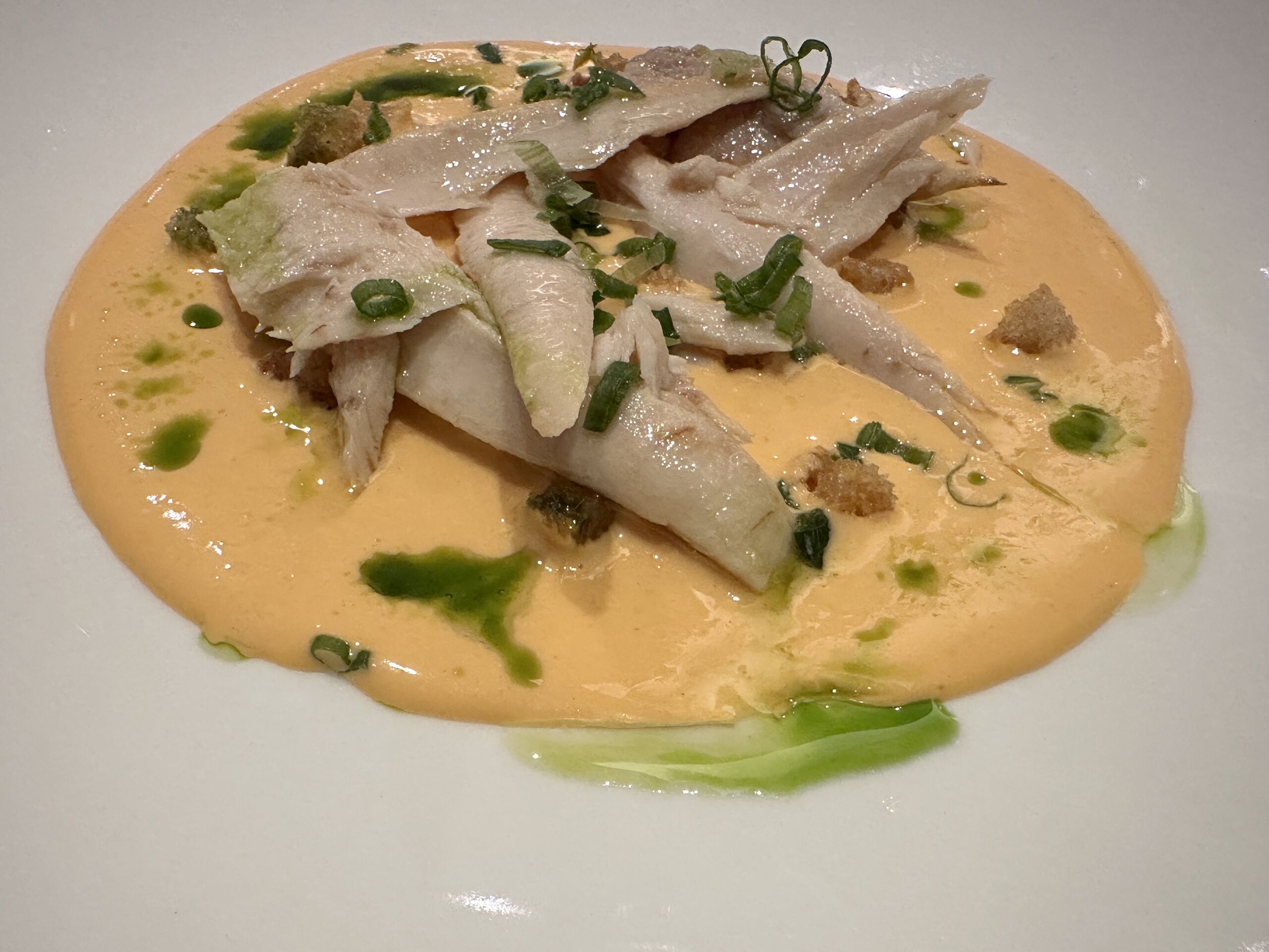 De aperitivo y de esos platos de verano probamos un fantástico chicharrón de Cádiz con aceite, limón y pan soplado (16,50 €) y continuamos con una extraordinaria ventresca de bonito en conserva de José Peña con salmorejo marino (26,90 €). Eso sí, n o te puedes perder sus escabeches, de los que ya os hablé en Libertad Digital en mi anterior visita a la fonda. Destacan el de raya a la naranja, el de verduras con nueces de macadamia o el clásico de perdiz con setas de temporada.