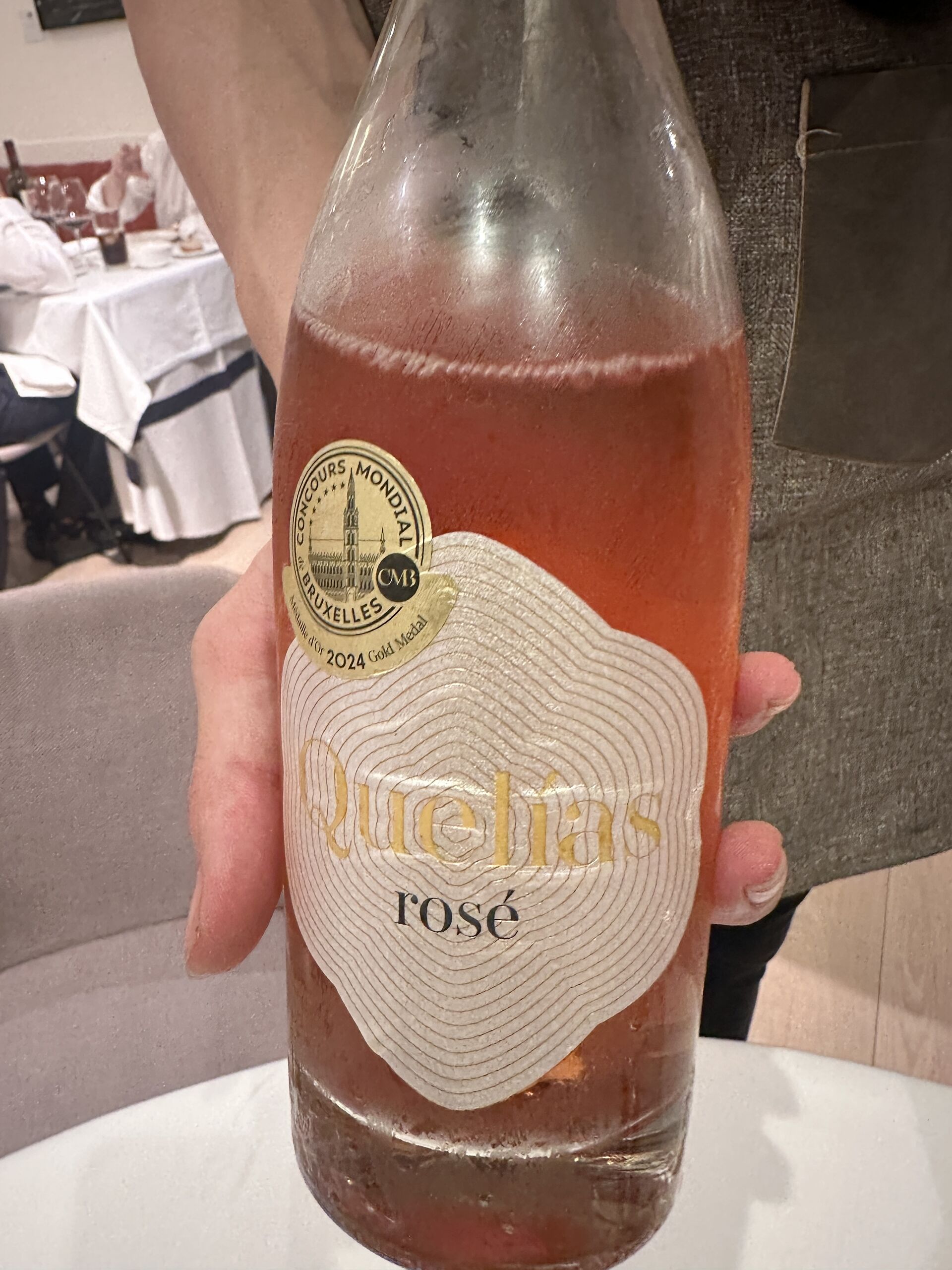 Empezamos con un buen vino blanco Quinta da Peza (25 €), elaborado por la bodega homónima con 100 % Godello bajo la DO Valdeorras. Seguimos con un vino rosado multipremiado Quelías Rosé (24 €), elaborado con uvas Albillo 50 %, Garnacha 30 %, Tempranillo 10 % y Verdejo 10 % por Bodegas Sinforiano bajo la DO Cigales. Con el arroz llegó el Sande de los Olivos (35 €), elaborado por Pago de Cirsus & Bodegas Zifar con Tempranillo 100 %. Y terminamos con un fantástico Néctar, elaborado por González Byass con vino procedente de uva Pedro Ximenez.