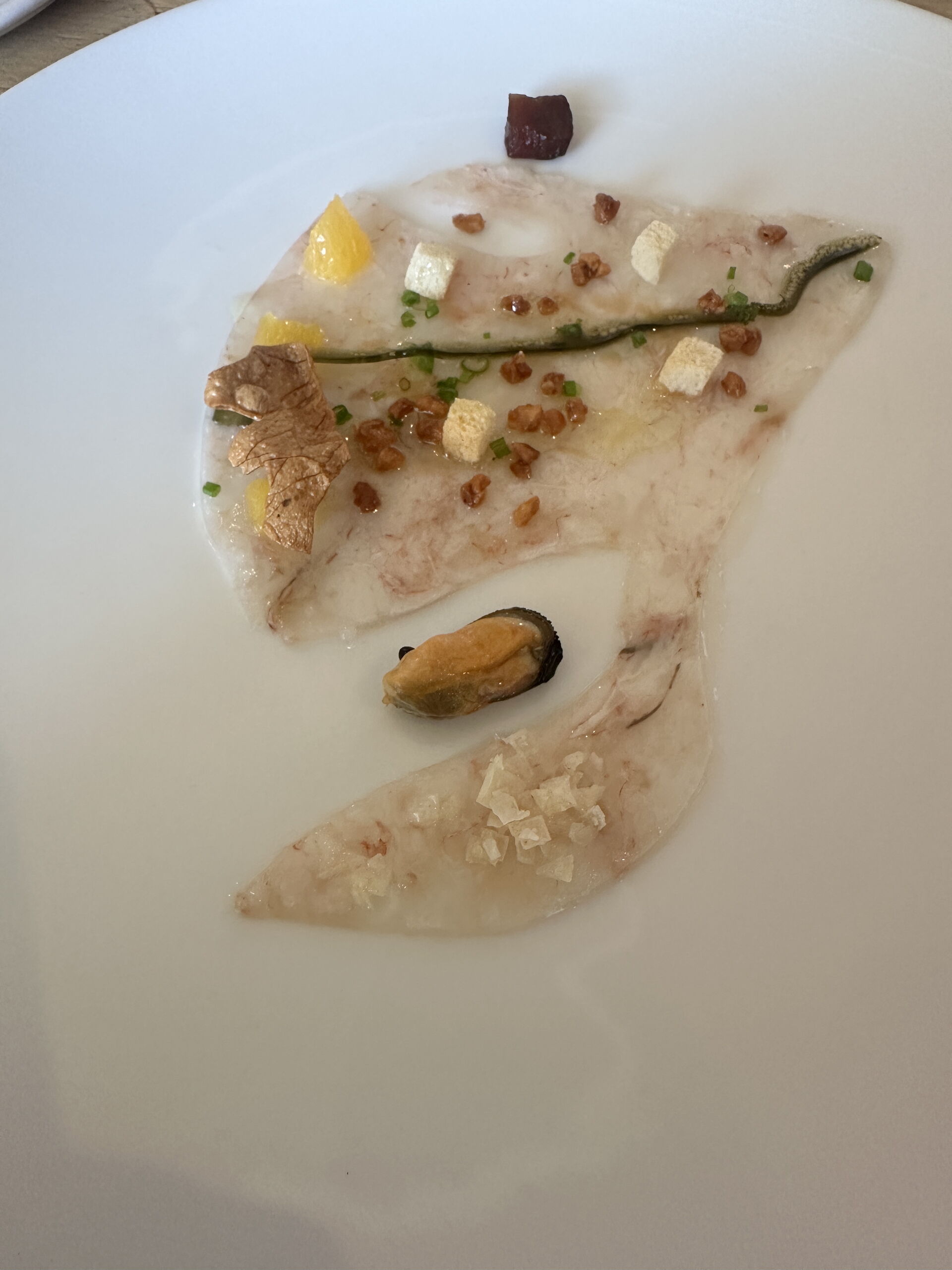 Para reflejar los sabores del Delta del Ebro ha elaborado un visual mapa elbarado con carpaccio de gamba blanca de la zona. En él se pude ver cómo el río Ebro, que es el vertebrador, separa la zona. Está hecho con un caldo de bonito con espirulina. En el lado derecho de las lagunas tenemos los mejillones. La montaña está hecha con las cabezas de la gamba blanca y al otro lado también tiene cítricos y atún rojo Balfegó.
