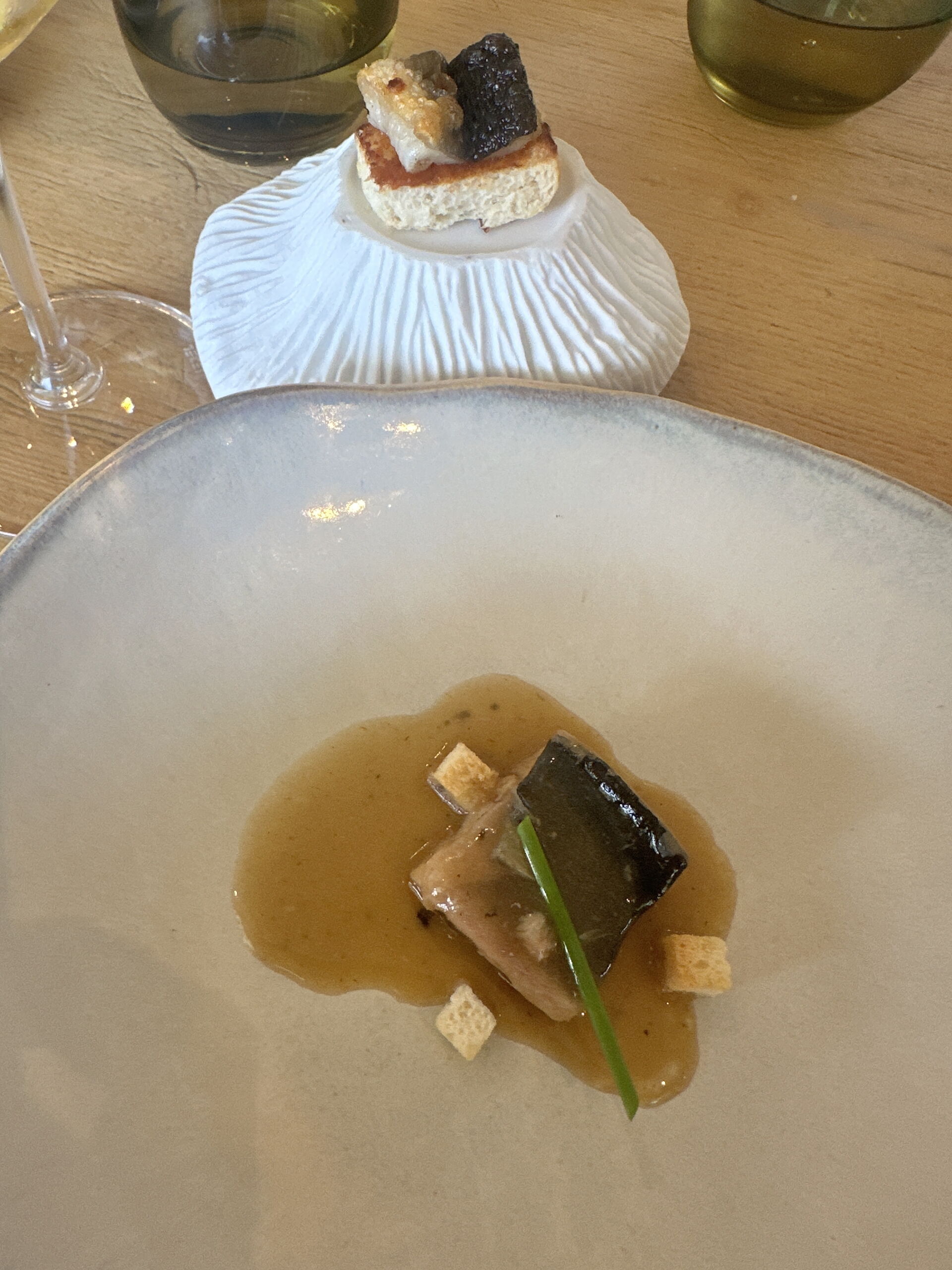 Otro de los productos estrella de la zona es la anguila y Joan la prepara en dos pases: suquet y chapadillo. El suquet de anguila era el desayuno por excelencia de salir al campo y la dureza que conlleva trabajarlo. Con su toque picantito y hecho de la misma forma que lo hacían los abuelos del chef y acompañado de crostón de pan tostado. La anguila en chapadillo lo hace con las anguilas más gruesas del Delta, la cura con salmorra, añade especias y la deja secar al aire durante un mes.