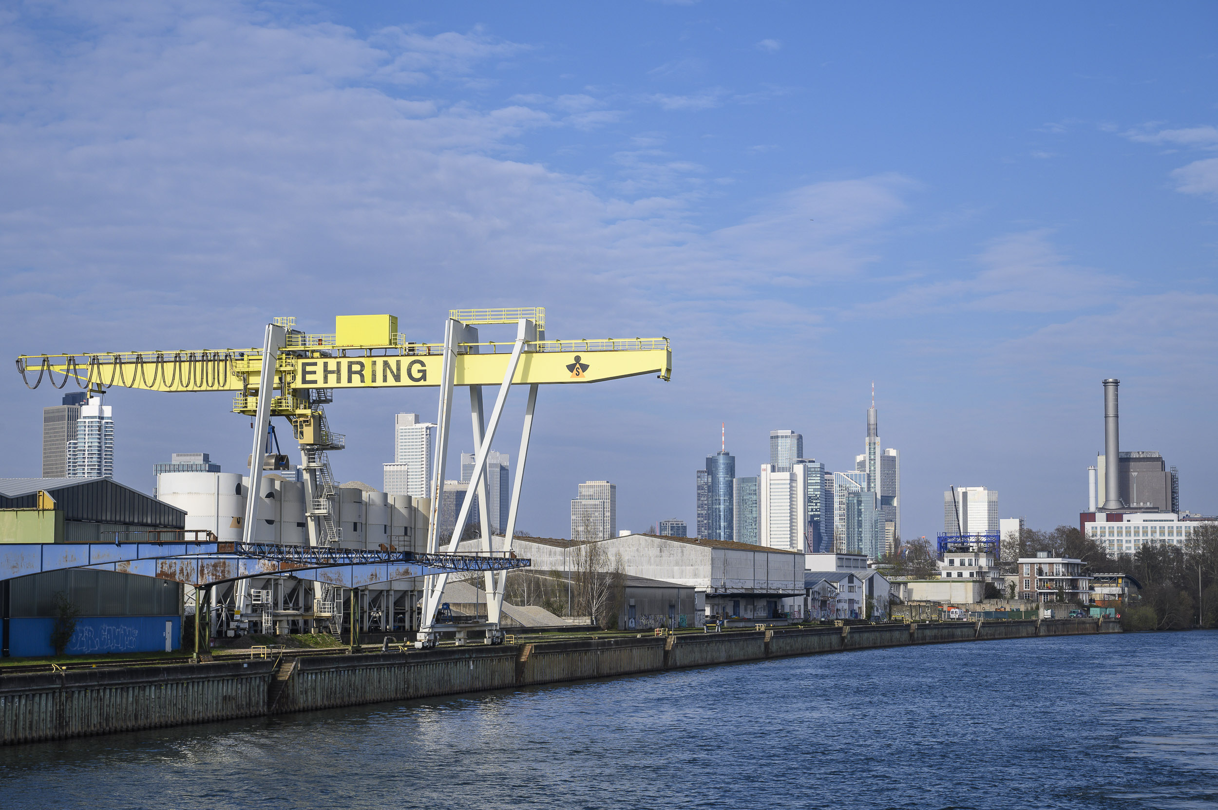 Instalaciones industriales a la orilla de Meno, con el skyline de Fráncfort al fondo.
