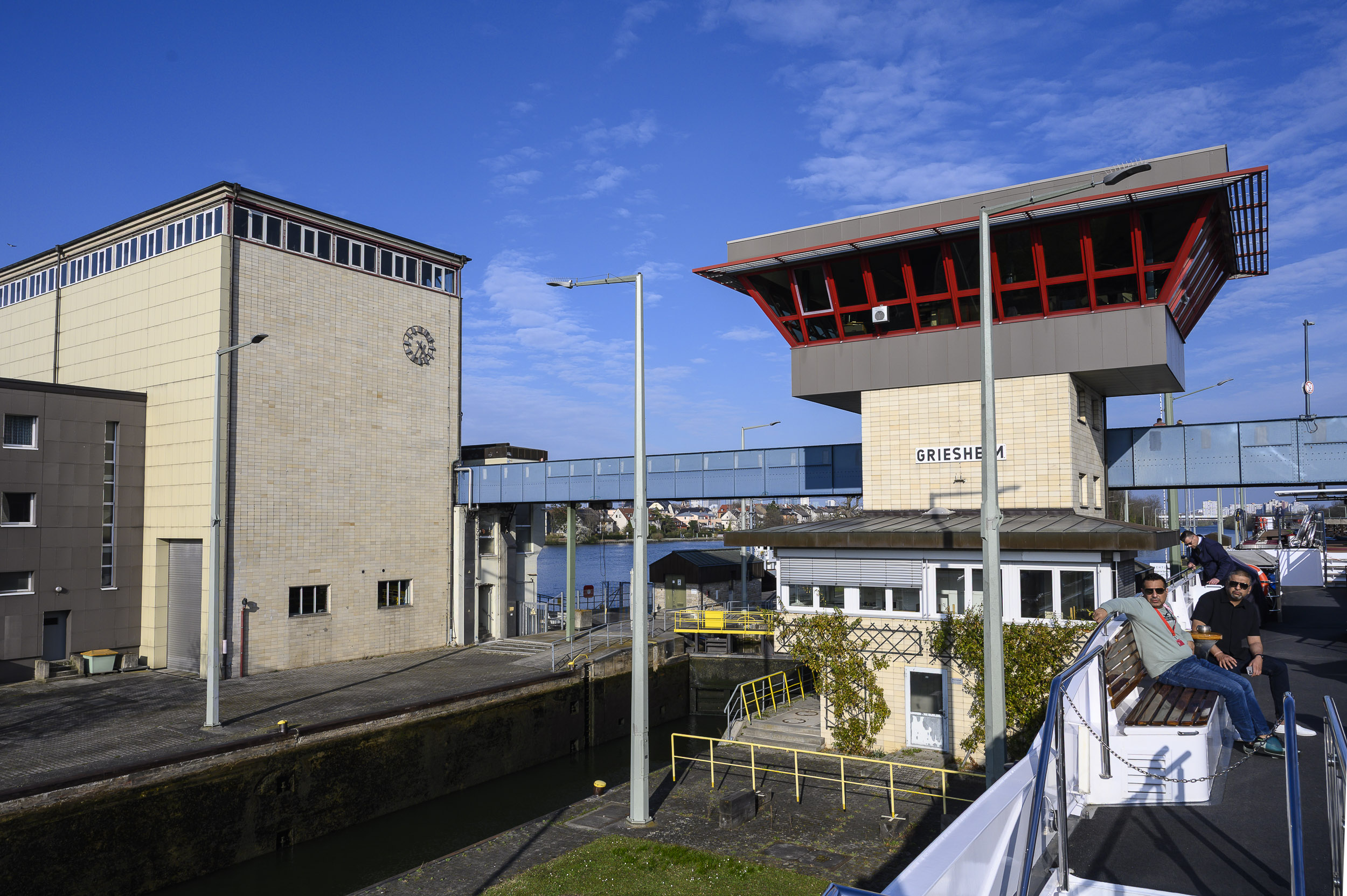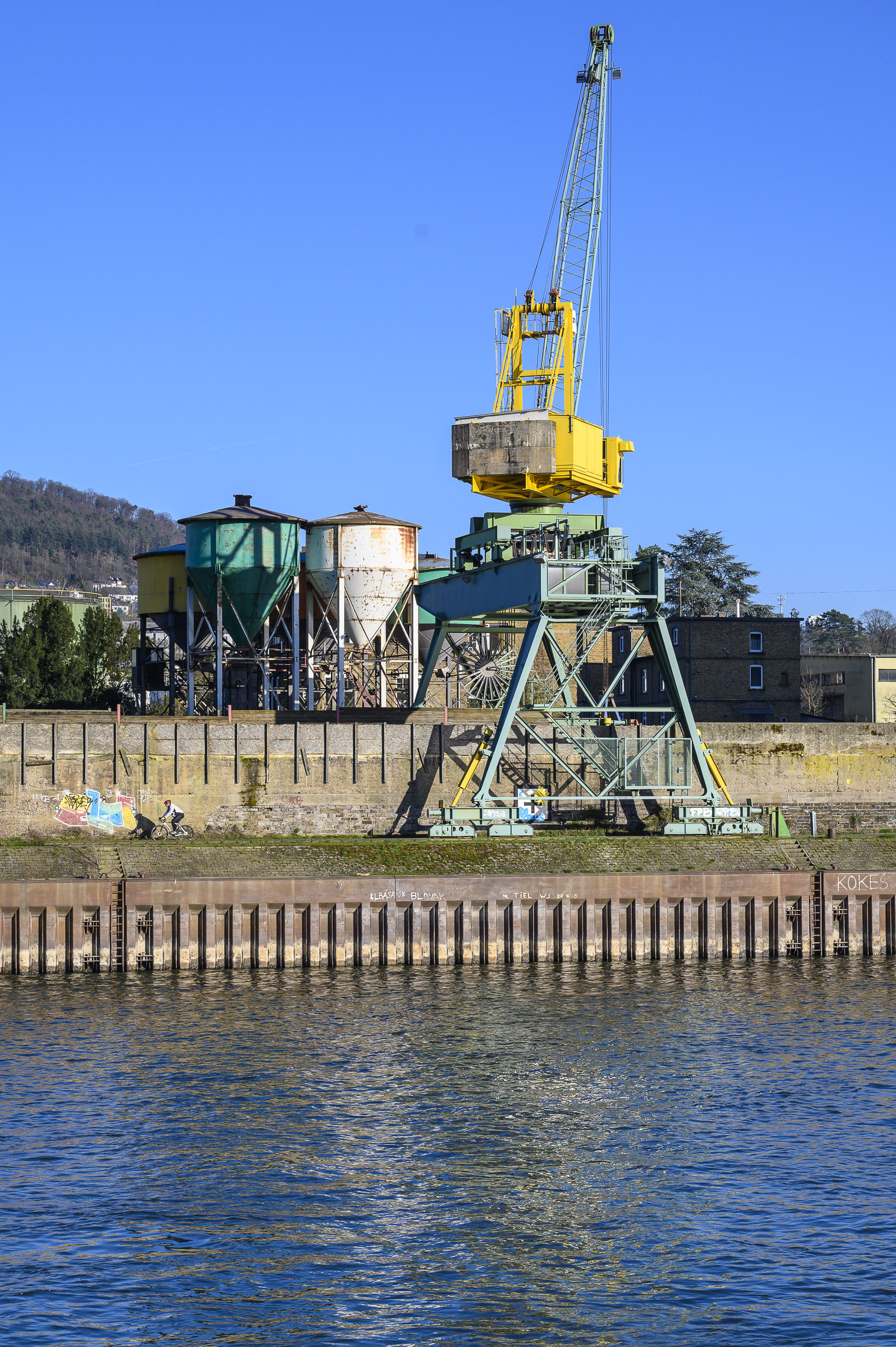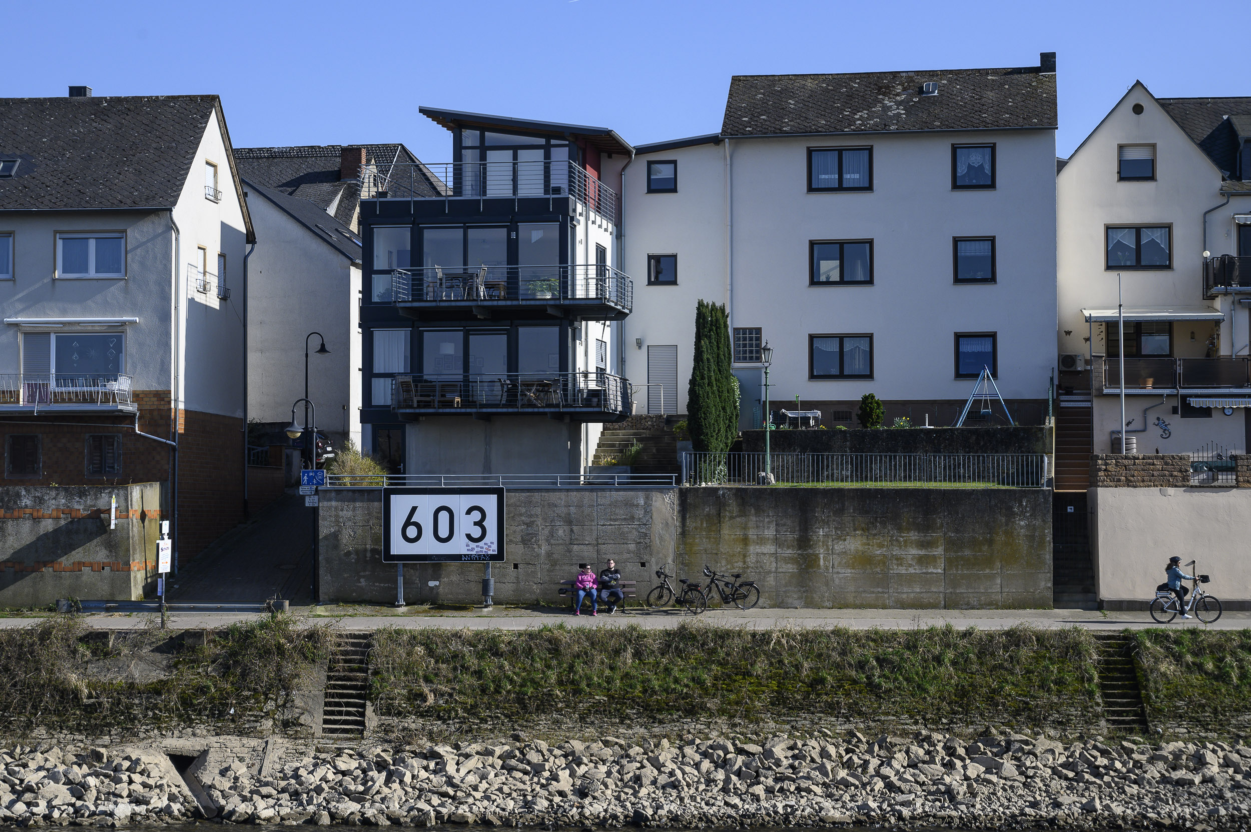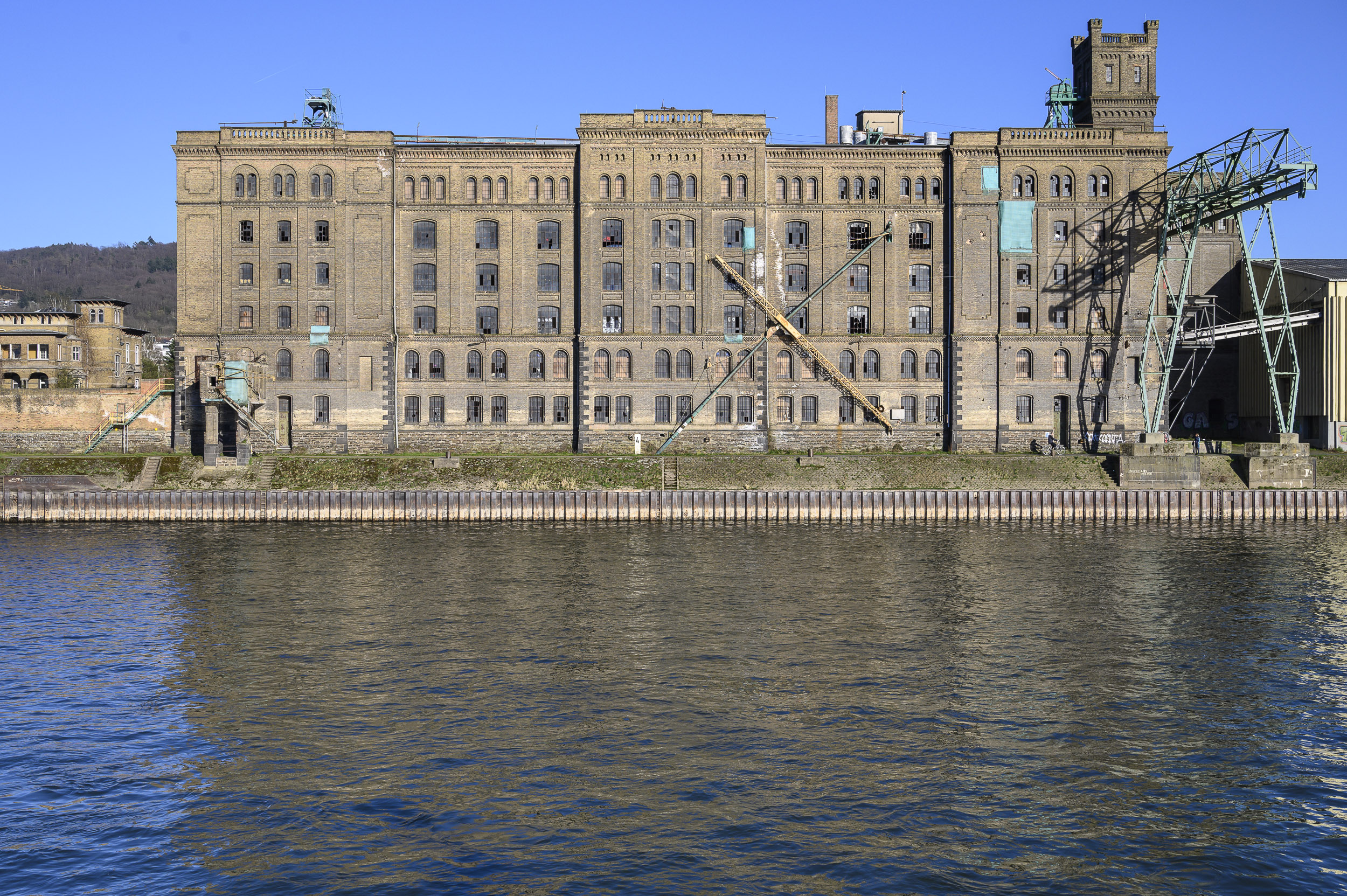Un edificio, probablemente una antigua fábrica, a la orilla del Rin.