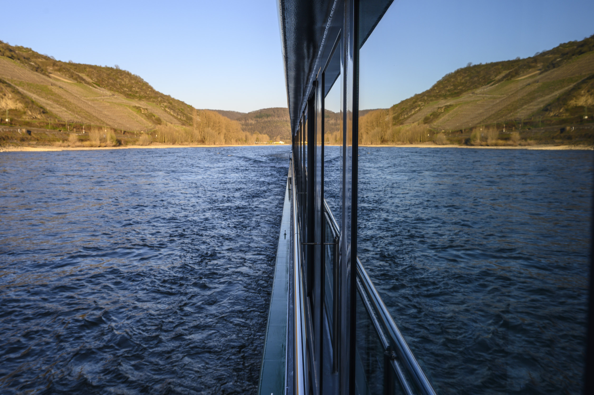 El paisaje de viñedos a la orilla del Rin, reflejados en los ventanales del barco.