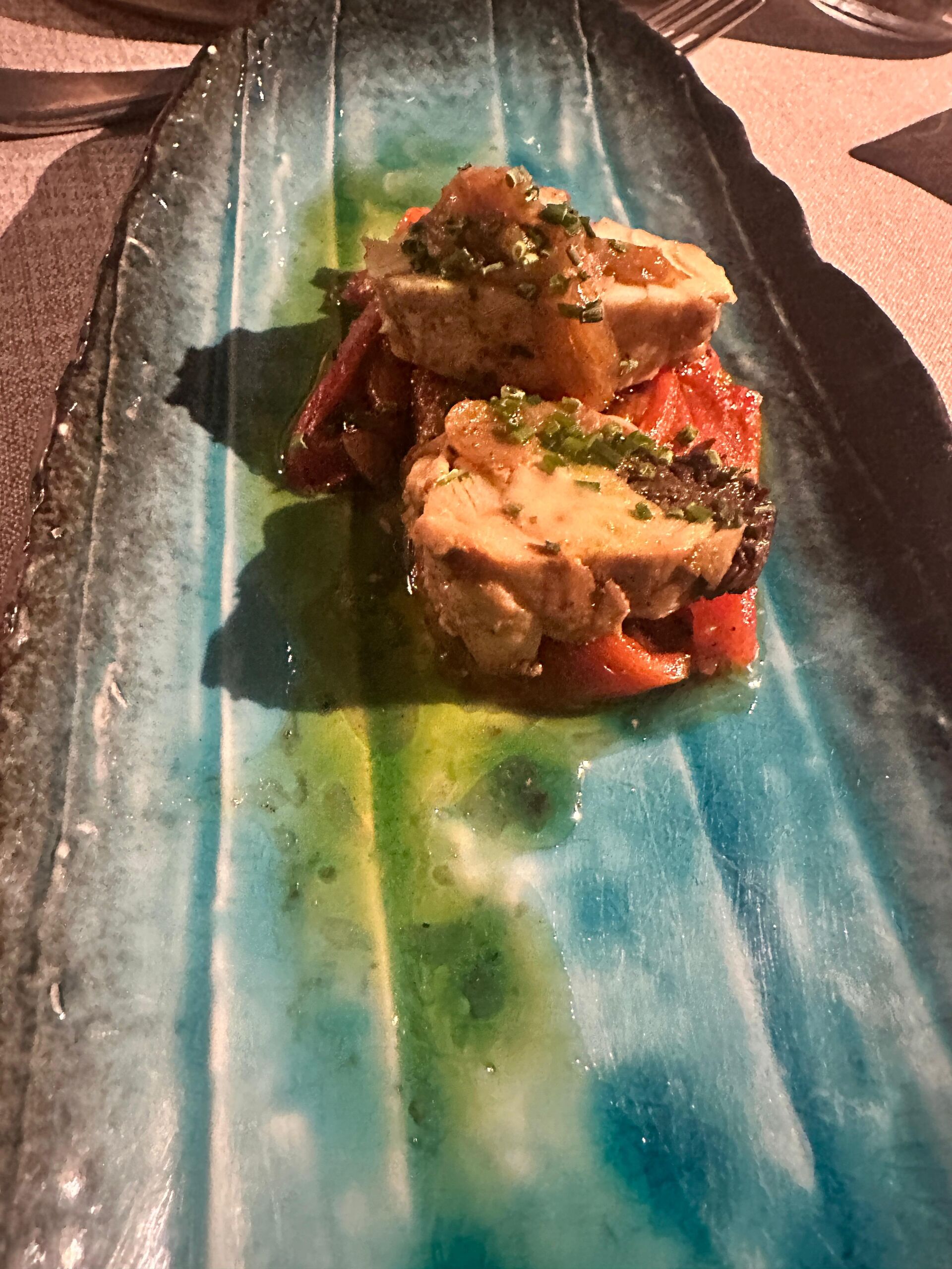 Ya sentados en sus cómodas butacas bajo la mesa con mantel blanco, llegan los aperitivos de salchichón ibérico, gazpacho de mandarina, piruleta de parmesano, y pan de Panes con Alma con AOVE de la casa, Patio de Viana, un aceite de la variedad picual. Con un fantástico vino blanco La Maldición – Bodegas Cinco Leguas despedimos la temporada con un exquisito bonito escabechado con pimientos a la llama y cebolla también escabechada. Los escabeches los elabora el propio chef y no con un vinagre cualquiera, con un Pedro Ximénez que le aporta ese toque especial entre ácido y dulce.