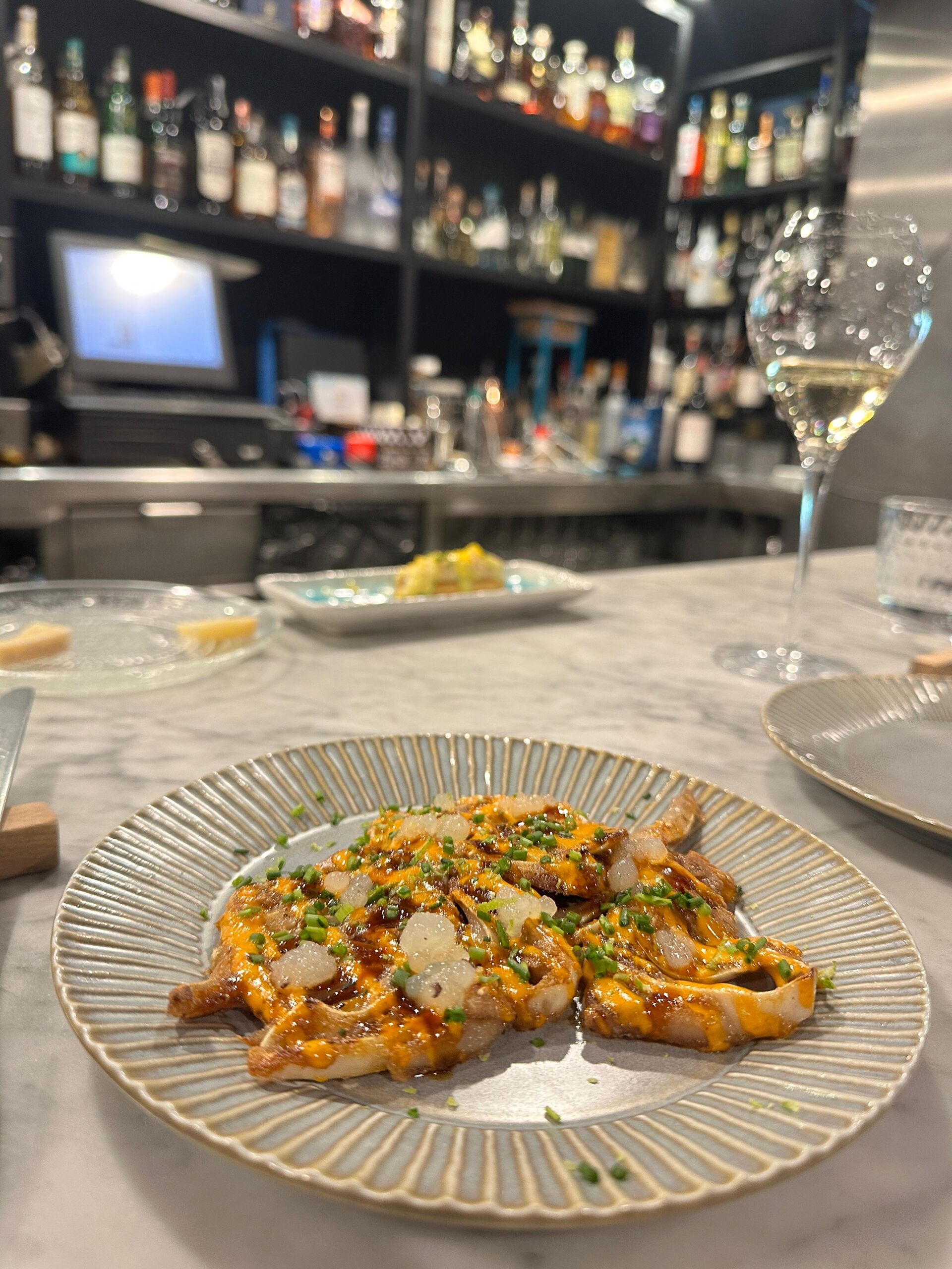 Para ir avanzando sobre la carta de la nueva temporada que está preparando el chef Fuentes, nos saca una oreja brava con caviar de cítricos, perfecta de sabor y en la que los amantes del picante, entre los que me incluyo, querrán que pique de verdad. El toque cítrico es idóneo para rebajar la grasa de la casquería.
