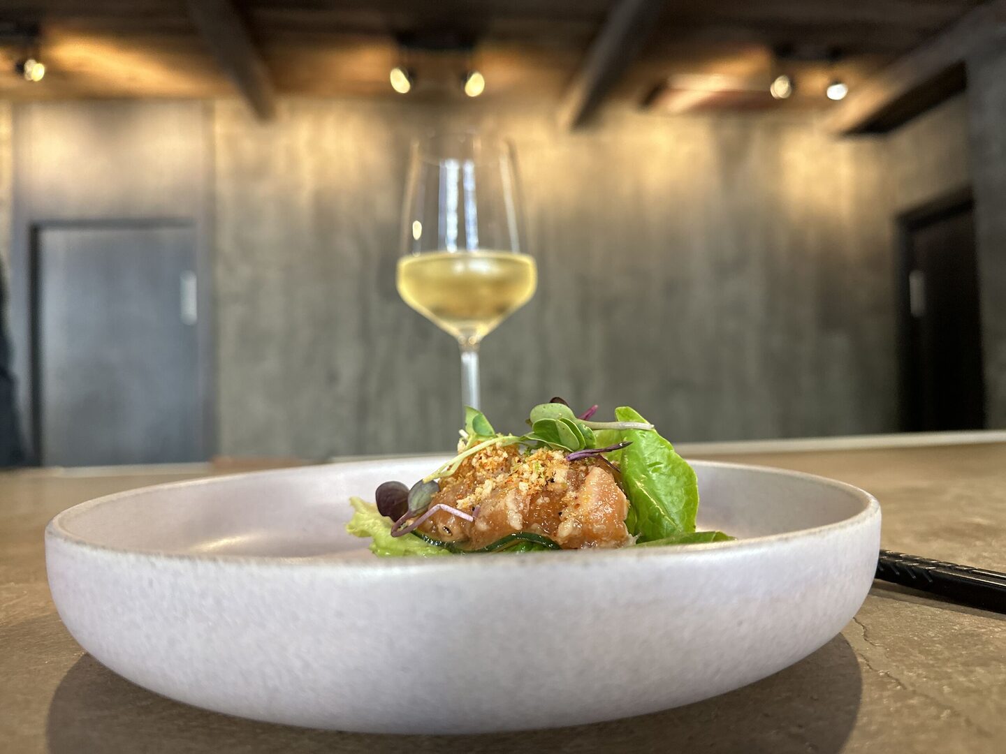 Sentados en la barra, ya sea a las 13:00, 14:15 y 15:30 para la comida, o las 20:00, 21:15 y 22:30 para la cena, empiezas a ver cómo el chef y sus ayudantes comienzan a elaborar el primer pase mientras te sirven la bebida, en nuestro caso un vino blanco Leirana, elaborado por la Bodega Forjas del Salnés con 100 % Albariño bajo la DO Rías Baixas.