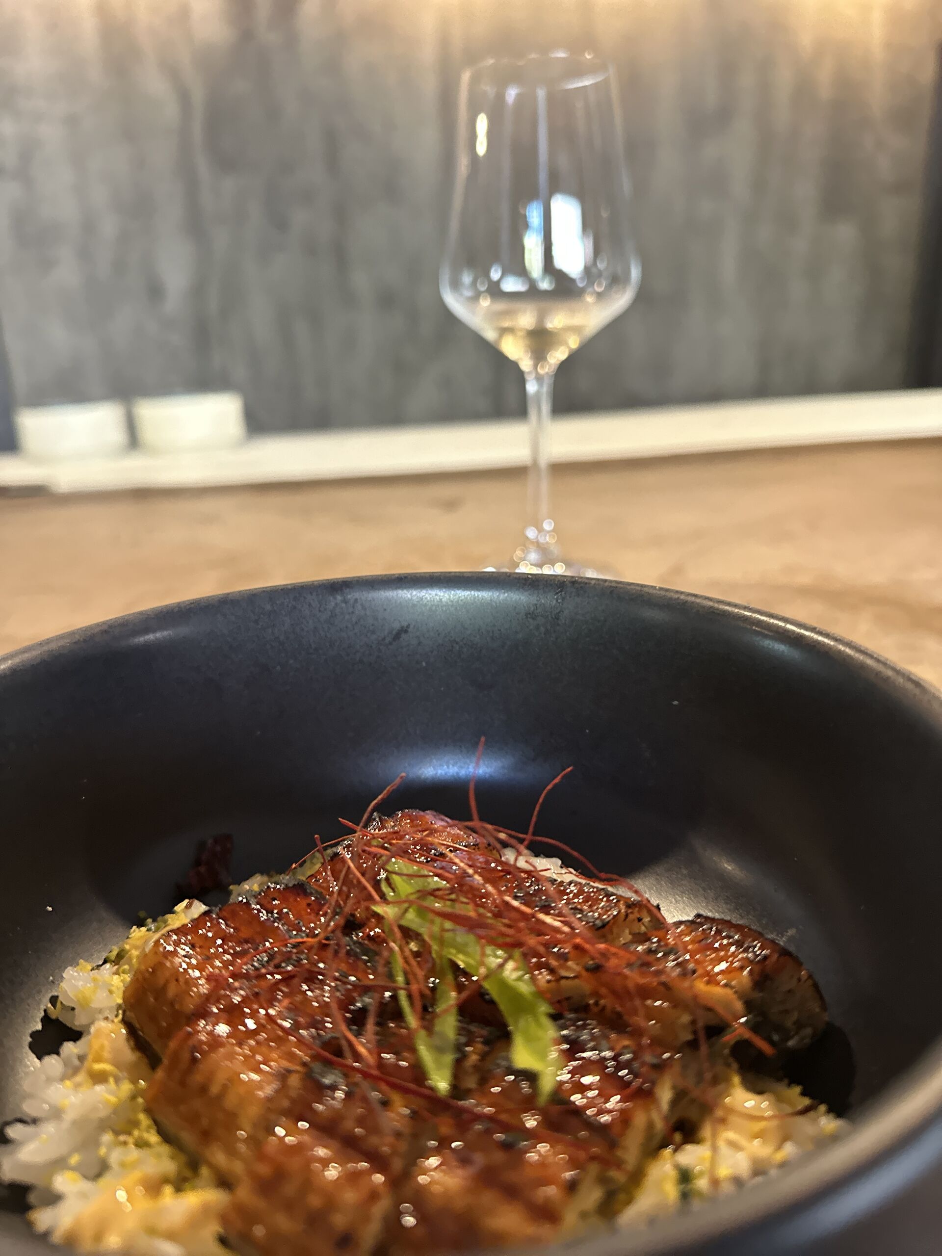 El penúltimo pase es el que les dio a conocer, el riquísimo domburi de anguila kabayaki. Domburi significa cuenco de arroz, en este caso lo acompañan de una mayonesa con ostras, furikake a base de alga, huevo y pescado deshidratado la anguila kabayaki caramelizada con azúcar de caña y coronada con un poco de cebolleta e ito togarashi, una especia japonesa que se obtiene de la guindilla roja disecada.