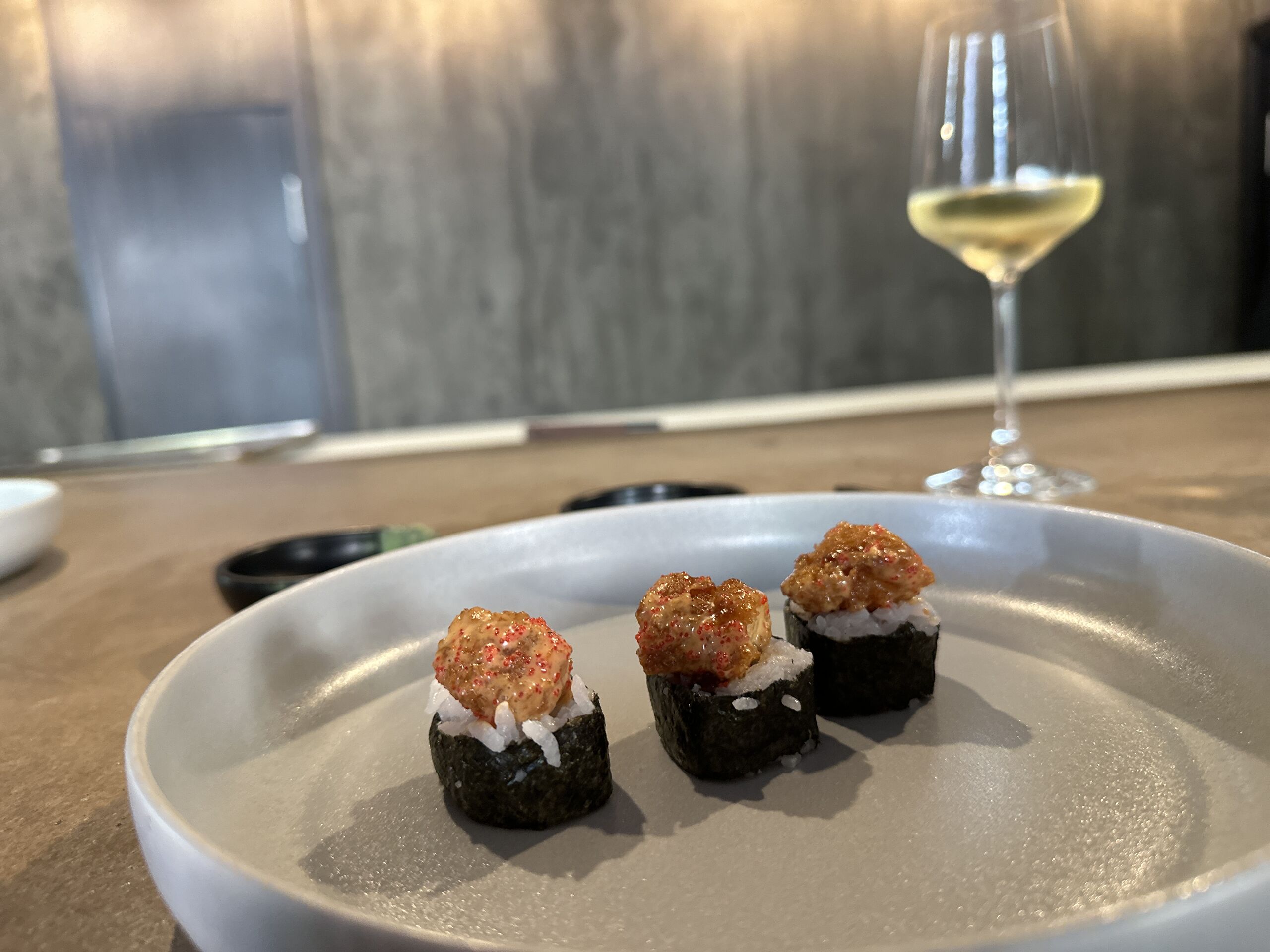 El chef siempre pregunta antes de empezar la explicación del siguiente plato qué te ha parecido el anterior, así que sabe de buena tinta que lo que hace gusta. Como gustan y mucho los makis de atún y langostino frito, marinados con pimienta, jengibre, soja y miel, por encima le colocan un langostino frito mezclado con salsa spicy y masago o huevas de pez volador.