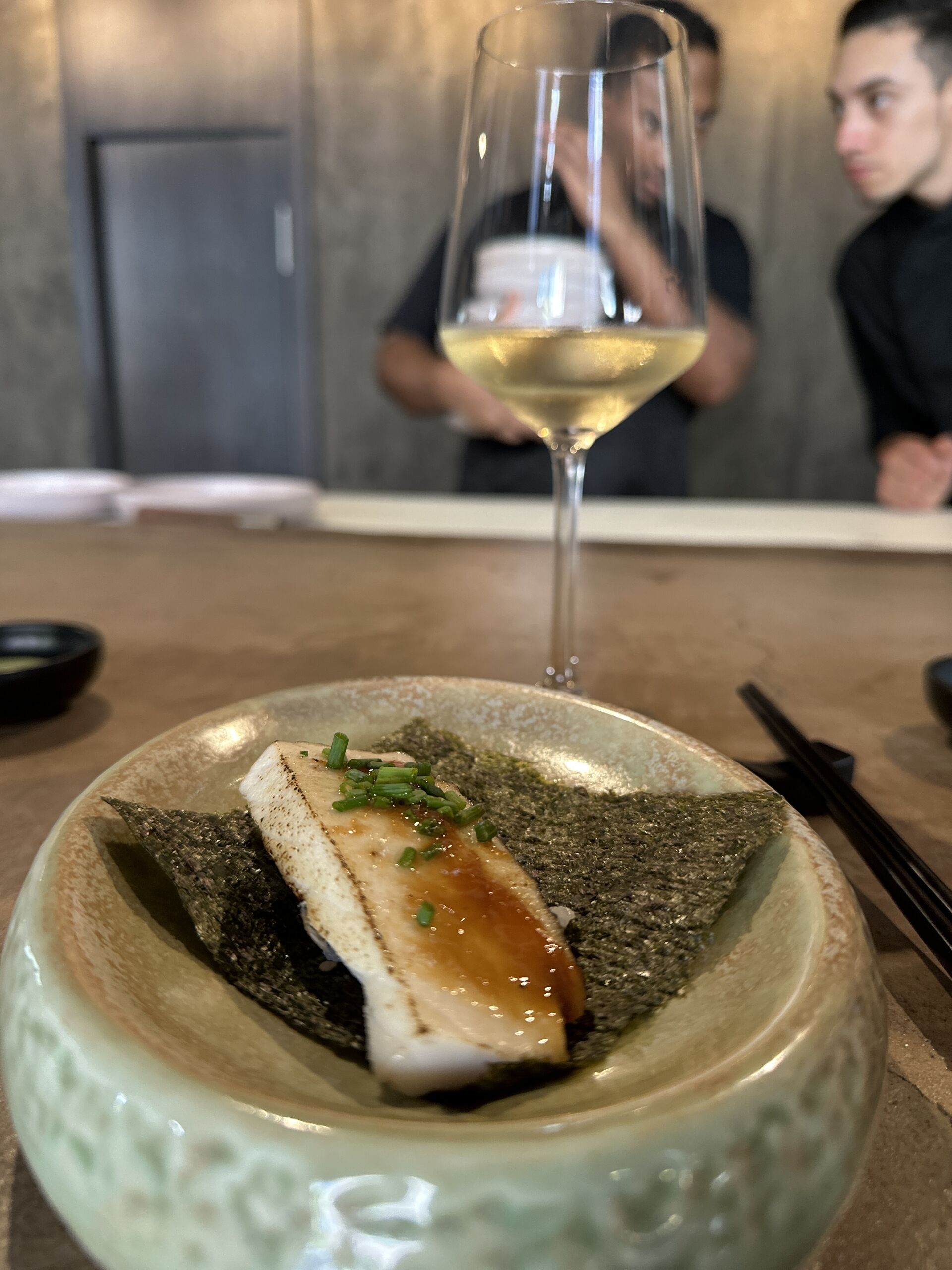 El segundo pase, y no será el único, es para comer con las manos, en este caso como si fuera un taco mexicano. Un rico temaki de pez mantequilla en la que la base es una alga nori, por encima su arroz avinagrado mezclado con hoja de shiso y sésamo y encima el pez mantequilla previamente flambeado con una salsa miso y coronado con cebollino.