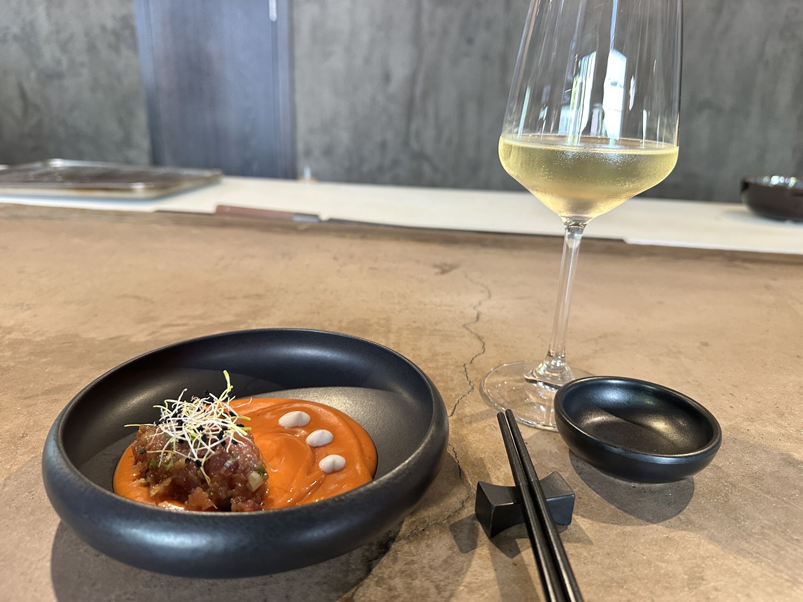 Antes de probar el plato, el chef procede a contarte lo que vas a comer mientras el aroma llega a tus receptores olfativos y comienzas a salivar con este espejo de salmorejo con tartar de atún, con un falso alioli de leche de coco y brotes de ajo. La combinación del salmorejo con el túnido es una delicia.