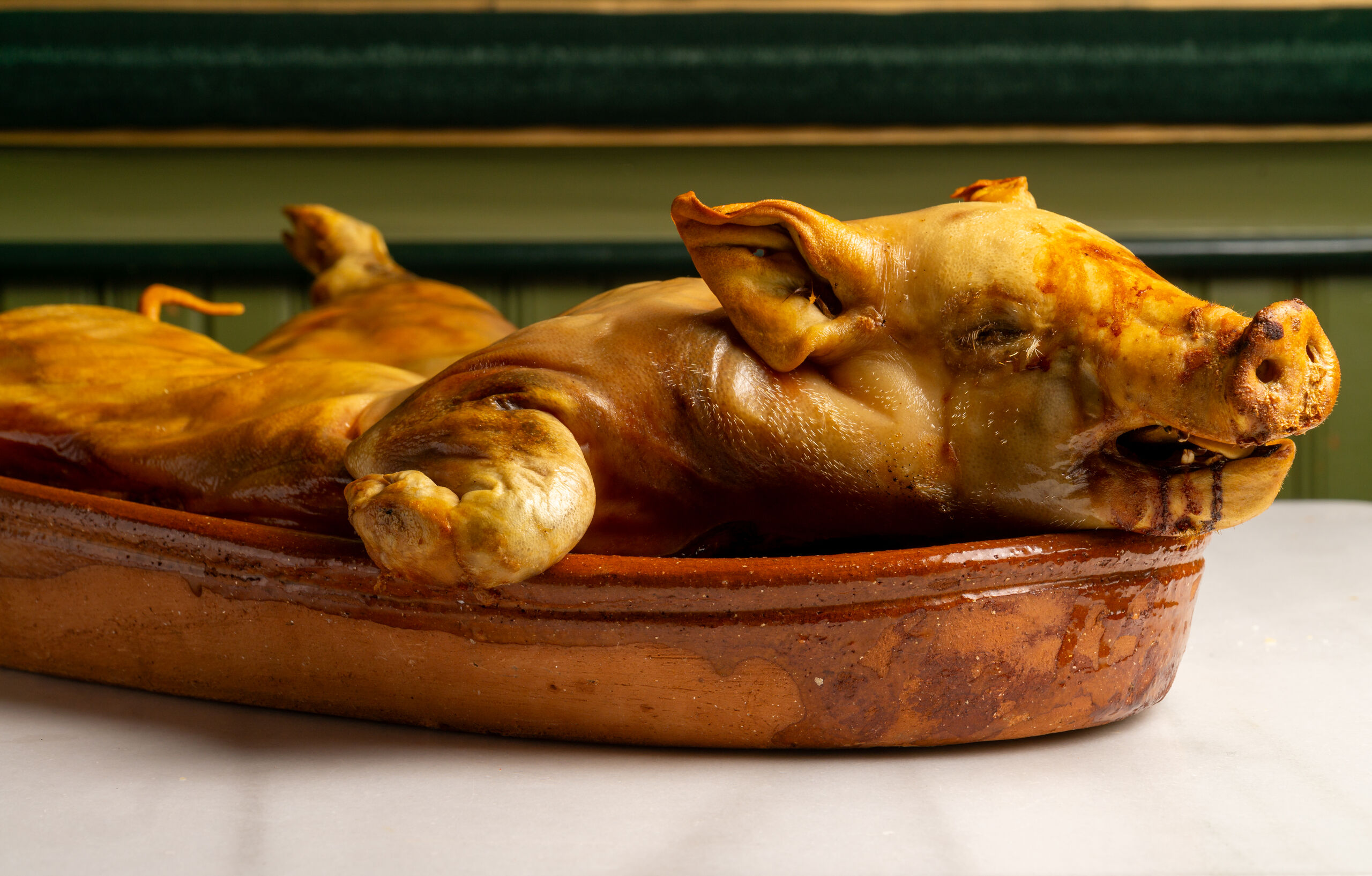 Pero no hay cochinillo que se precie sin su forma tradicional de partirlo. Porque, como nos cuenta Marisa, la familia Duque lleva 130 años partiendo un cochinillo con el borde del plato y con una frase que se ha transmitido de forma oral de padres a hijos: "Fue Enrique IV, rey de Castilla, quien otorgó el privilegio especial a los maestros asadores de partir con el borde del plato un cochinillo. Se trata de un animalito de 21 días de edad y 4 kilos de peso y, si lo asamos correctamente en un horno de leña, su piel estará crujiente. Desde entonces, en casa, se sigue con este menester y se dice así: "Estos cochinillos de por las tierras de Segovia, asados y dorados en Duque, se lo vamos a dedicar con muchísimo cariño a ustedes, ¡salud y buen provecho!"".