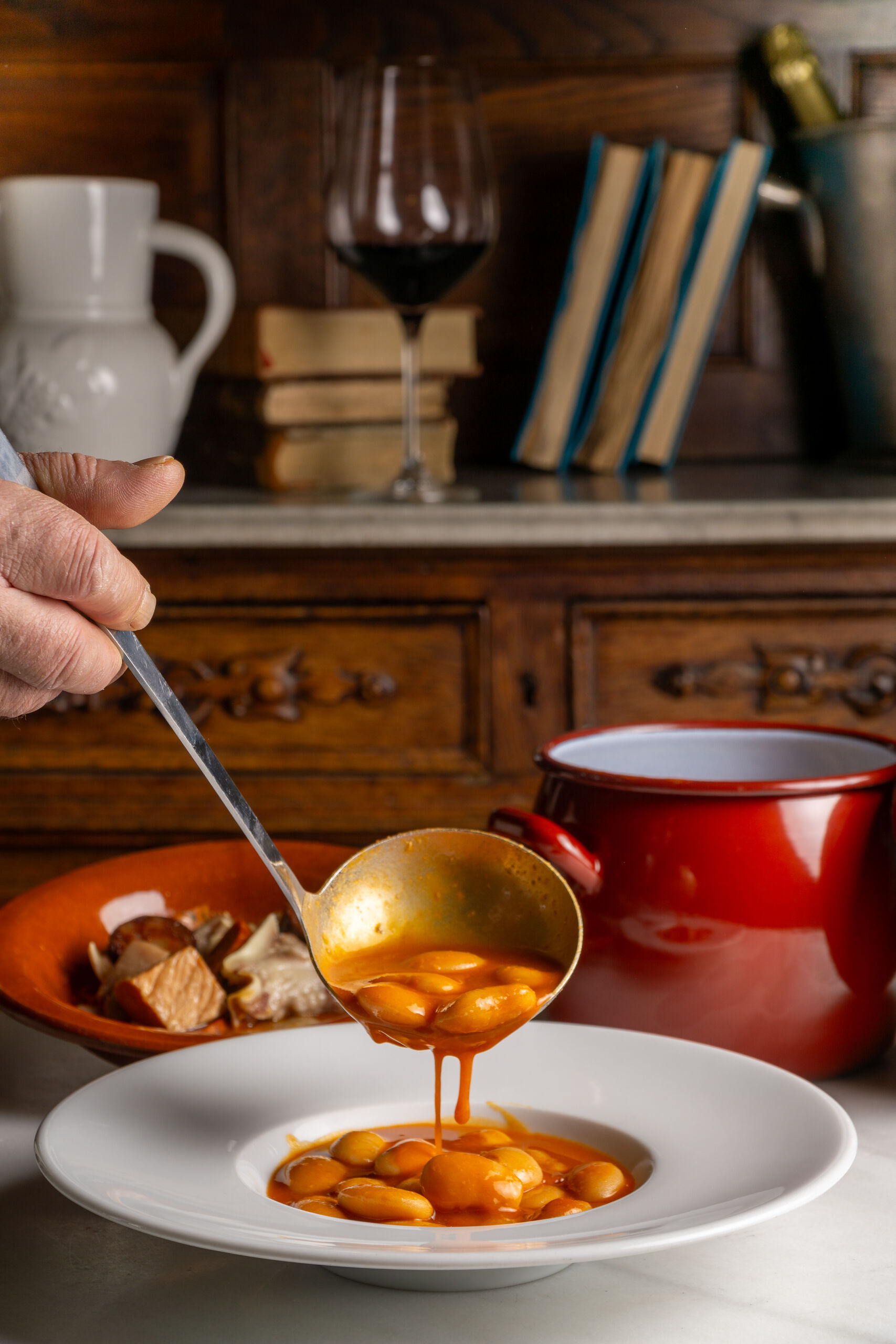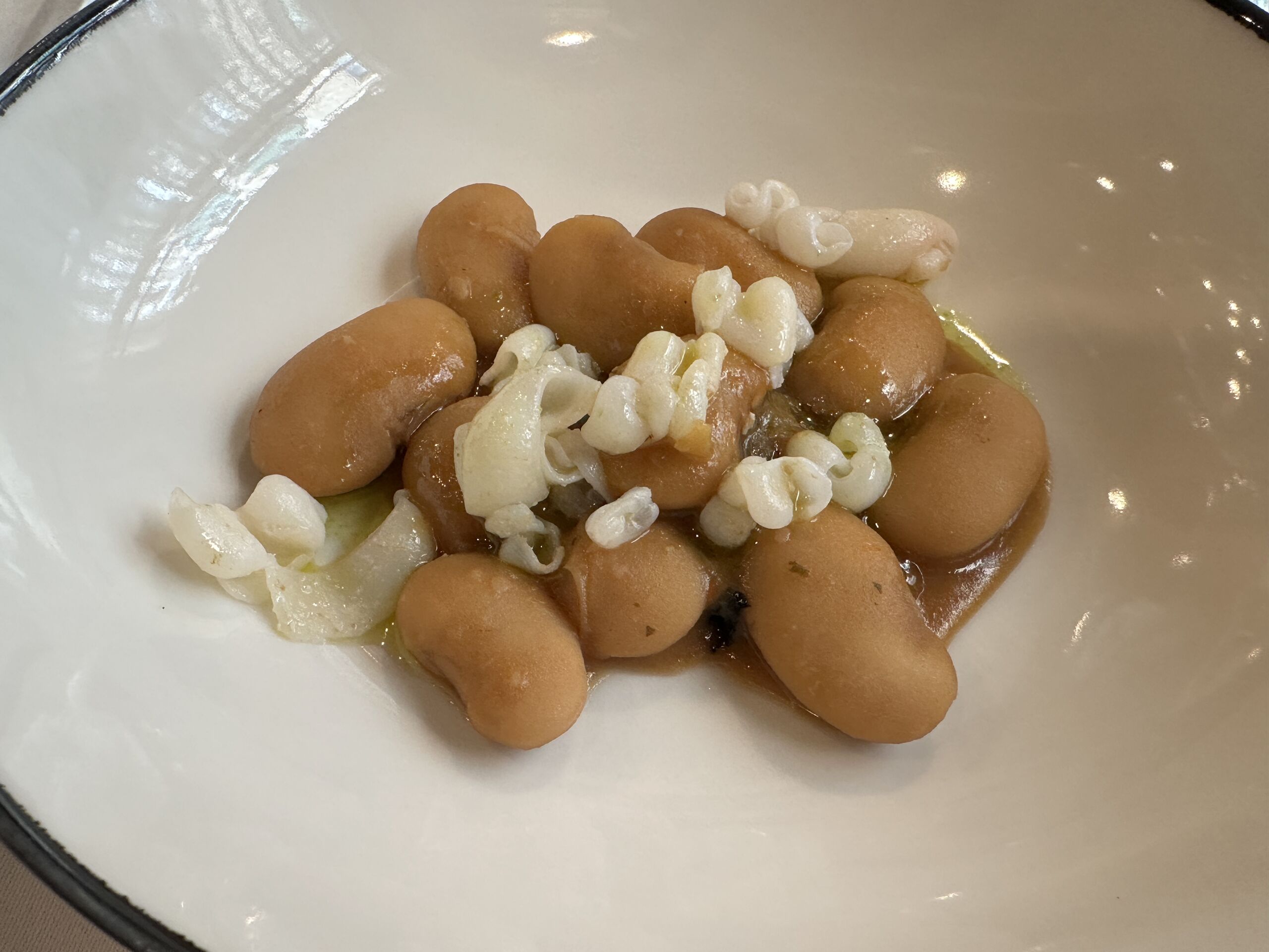 El verdadero espíritu de este menú tan especial llegó con los platos principales con los dos buques insignia de la gastronomía segoviana como son los judiones y el cochinillo. Para los judiones de La Granja, Óscar Velasco y Casa Duque elaboraron los judiones guisados con un poquito de calamar y de fondo, un buqué de puerro con la tinta del calamar, coronado con fideos de calamar, rábano picante en el propio guiso y aceite de albahaca.