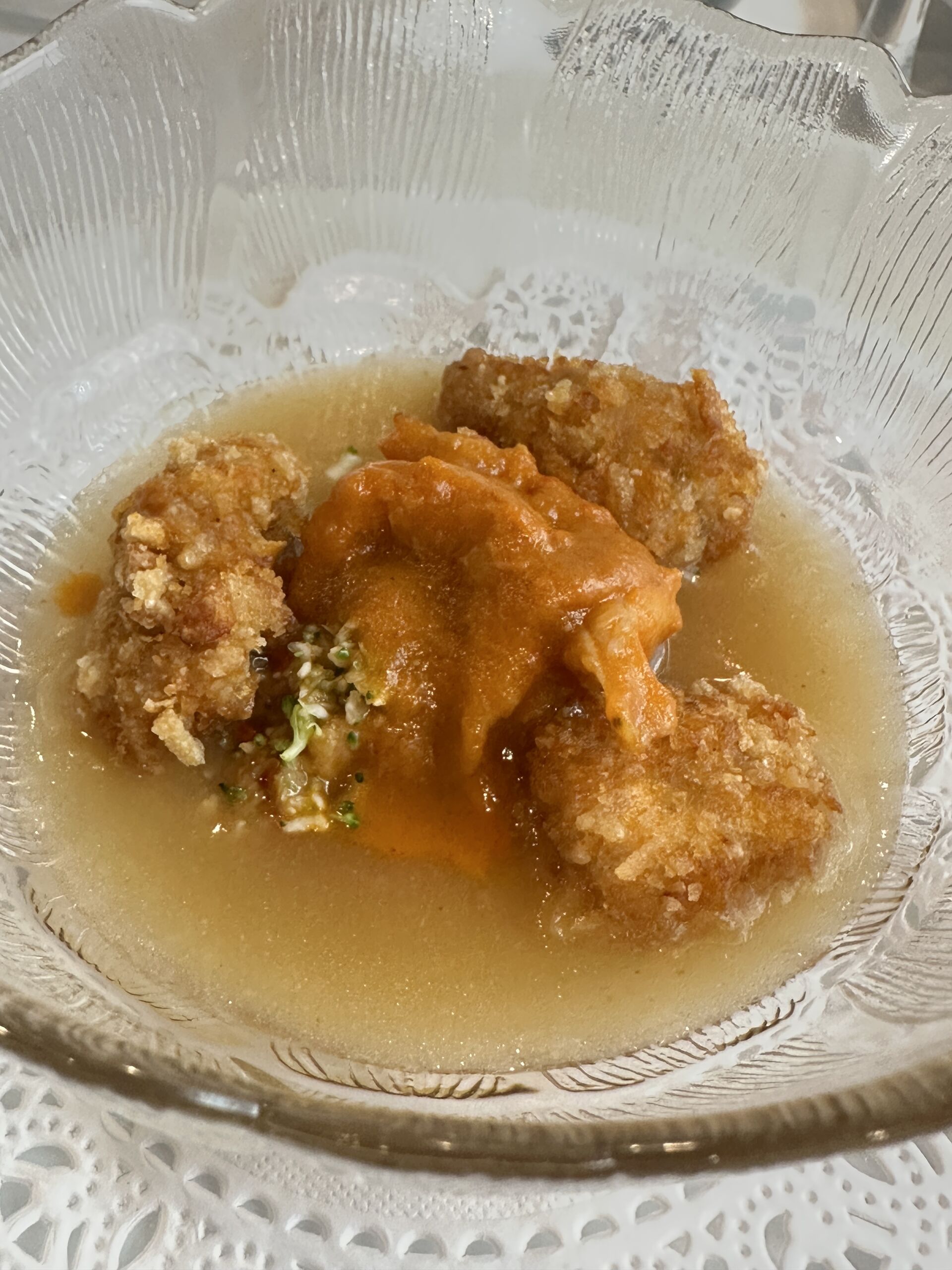 Fantástica la molleja frita de lechal con cangrejo de río y su fondo hecho con una emulsión de la propia cabeza y un txangurro con los propios cangrejos, servida por Casa Duque. También se presentó un bocado con mucho sabor: la coca de Mallorca con yema de huevo de codorniz y esencia de sobrasada.