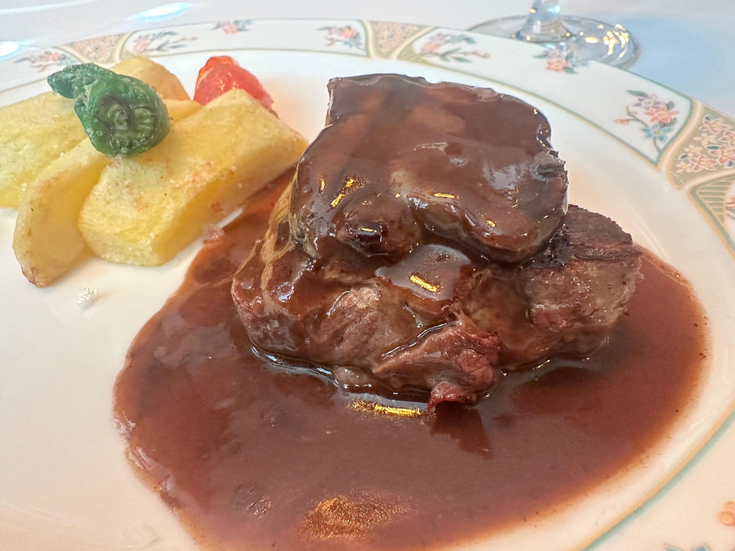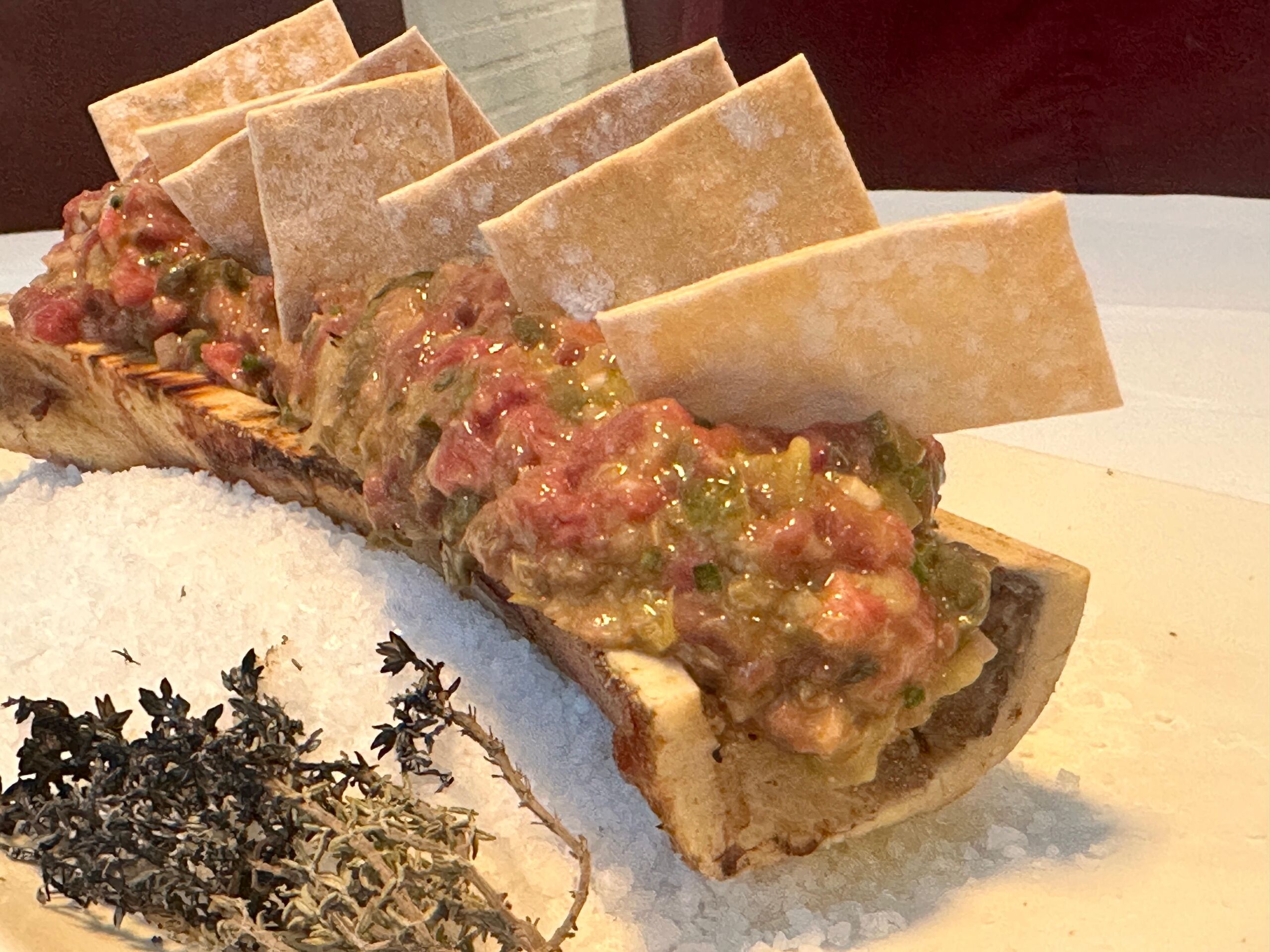 Los amantes de la carne también encuentran en Marmalé su espacio. Aquí se asan desde piezas de cerdo ibérico de proveedores de confianza como El Encinar de Humienta hasta cortes de vaca vieja madurada como el chuletón, el rib eye o el tomahawk. Pescados y carnes que dejamos para otra visita para decantarnos por un magnífico steak tartar de solomillo de vaca vieja sobre tuétano a la brasa (26 €), preparado con el toque de picante al gusto de cada comensal para no malograr el producto. Sabrosísimo y jugoso el solomillo con foie (28 €) y salsa Café de París, acompañado con cebollitas francesas glaseadas y patatas puente nuevo, que se refiere a aquellas que están cortadas en bastones rectangulares de unos 6 o 7 centímetros de largo y 1 cm de grosor.