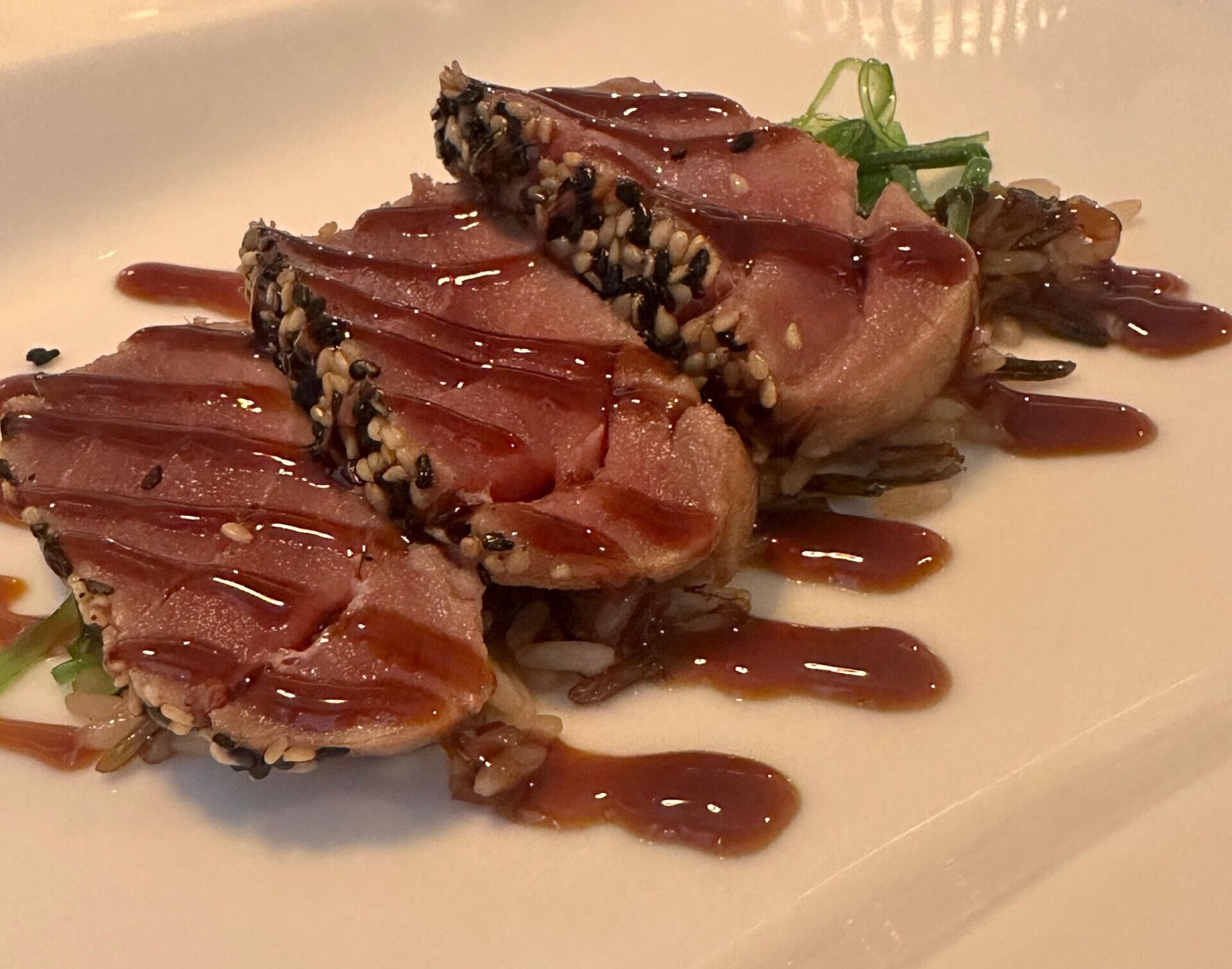 De esta cultura del fuego que se vive en Marmalé se comprueba desde los entrantes hasta sus platos principales. De los primeros encontramos un muy buen pulpo braseado ahumado con serrín de olivo (25 €) llega sobre una cama de patatas revolconas y torreznos. Una mezcla de mar y montaña que funciona a la perfección con un muy buen producto que se acompaña con ese plato tradicional de Extremadura y Castilla y León. Seguimos con esta mezcla de los que nos trae el mar y el campo con los chipirones en su tinta con alcachofas (18,90 €) servidos con una ligera mayonesa de albahaca y con la verdura con una tempura muy suave. Producto de calidad como el tataki de atún de almadraba marinado (25 €), servido sobre arroz salvaje, con alga wakame y reducción de soja.