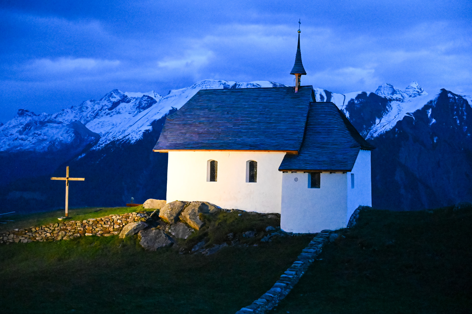 Otra estampa, esta vez de noche, de la iglesia de Bettmeralp, un idílico lugar en lo alto del valle del Ródano del Valais, rodeado por los imponentes picos de los Alpes.