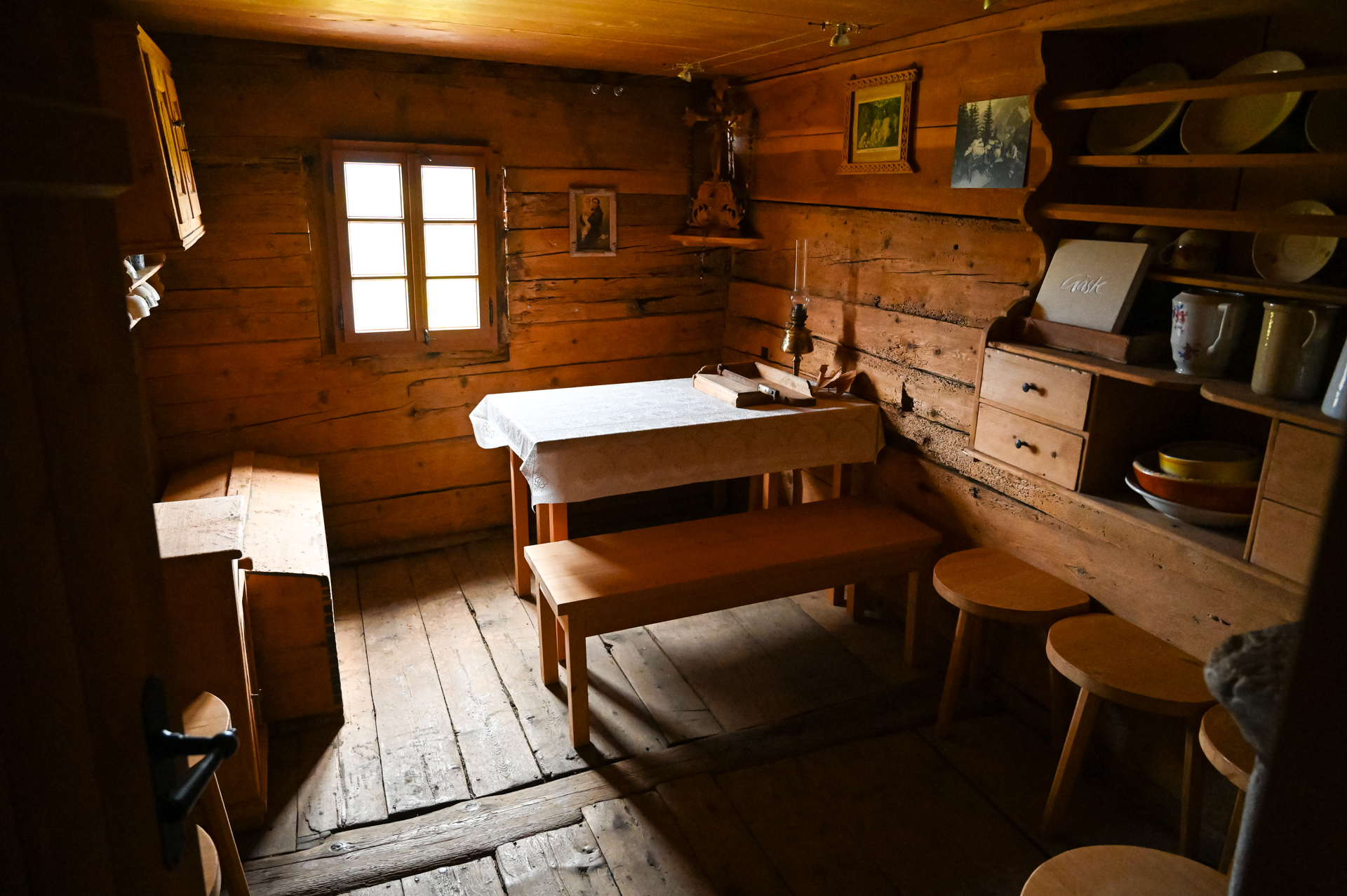 El interior de una de las cabañas que utilizaban los vecinos de estos pueblos de montaña hace poco menos de un siglo. Hechas de madera, en su interior vivían varias familias, en el piso de arriba, porque el de abajo estaba reservado para los animales.