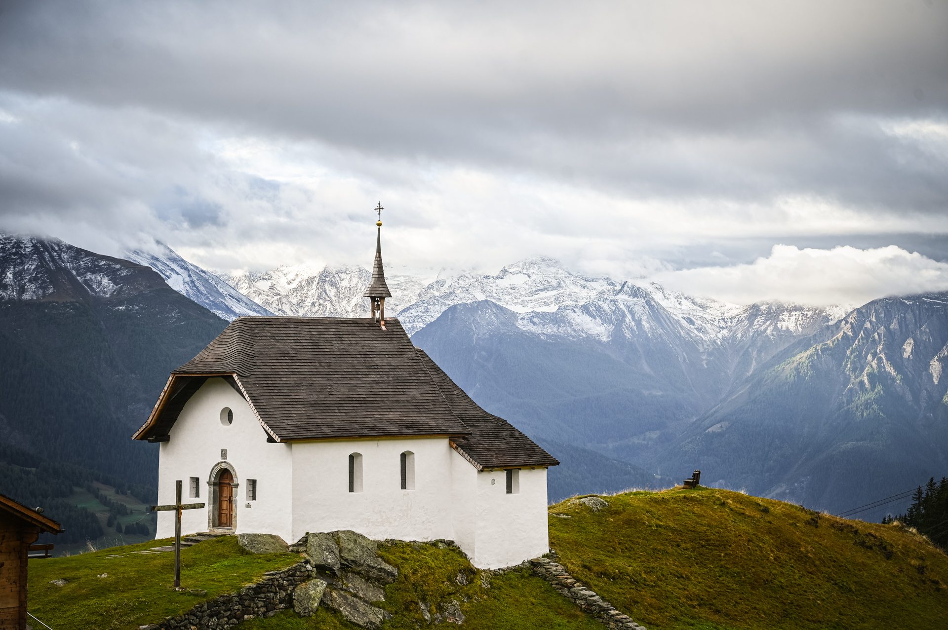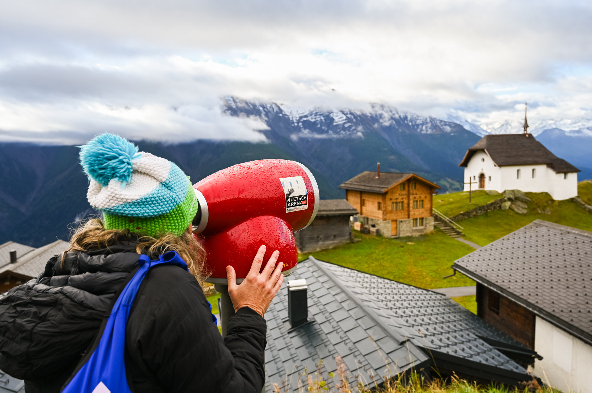 Bettmeralp destaca por sus casas de madera oscura y su icónica capilla blanca, imagen de postal que se graba en la retina.