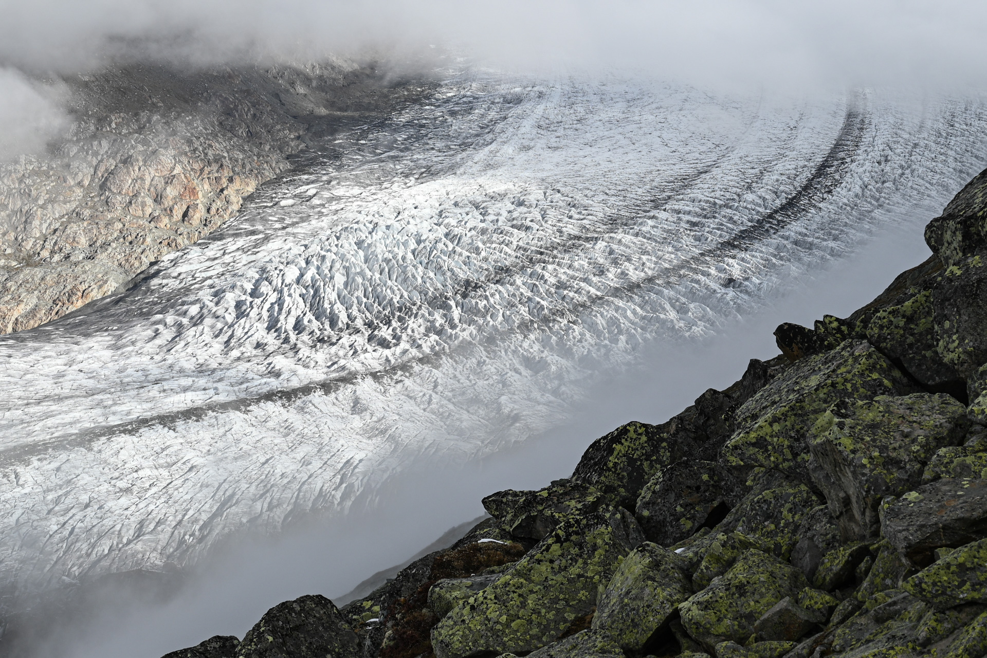 Otra vista del glaciar desde el mirador de Eggishorn, situado a casi tres mil metros de altura. Para visitarlo hay que protegerse del intenso frío con ropa adecuada, impermeable y cortavientos, incluso en verano.