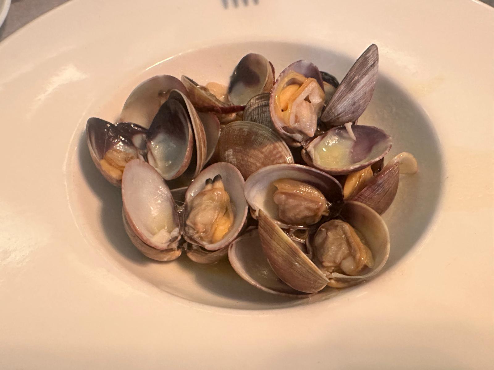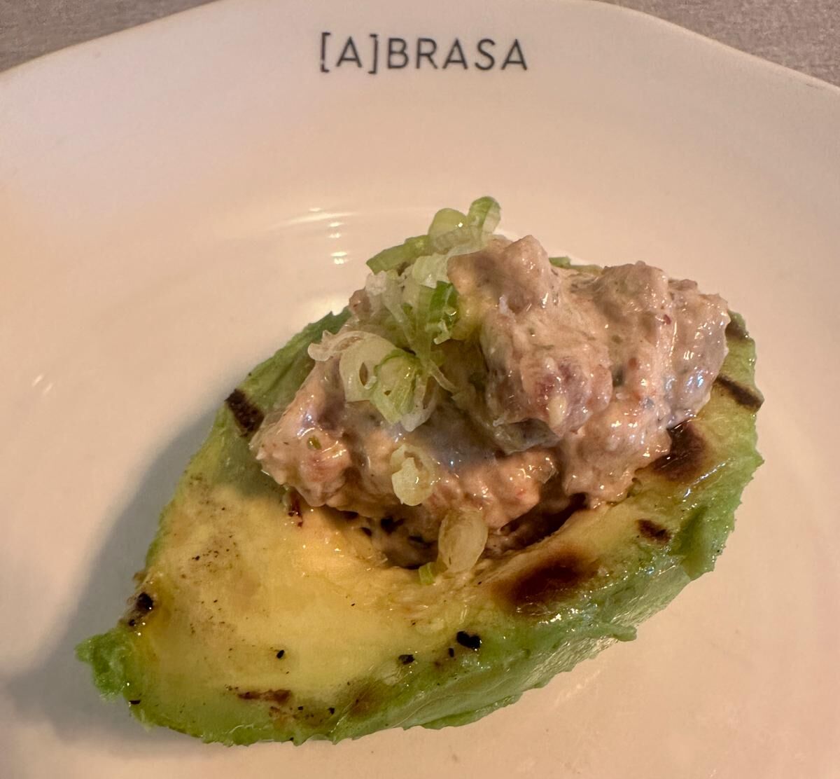 Pero si lo que quieres es disfrutar de las brasas, A Brasa te propone bocados como las berenjenas a la brasa con salsa romesco, las alcachofas de Tudela a la parrilla o el aguacate a la brasa relleno de tartar de atún (M 9 € / E 18 €) que, si bien con el relleno está rico, sí se agradecería un poco más de brasa a la fruta. De las sugerencias fuera de carta disfrutamos de unas muy buenas almejas a la sartén (23,50 €), buen producto, buen tamaño y buen sabor, con una salsa para untar pan o hacer barquitos con las propias conchas.
