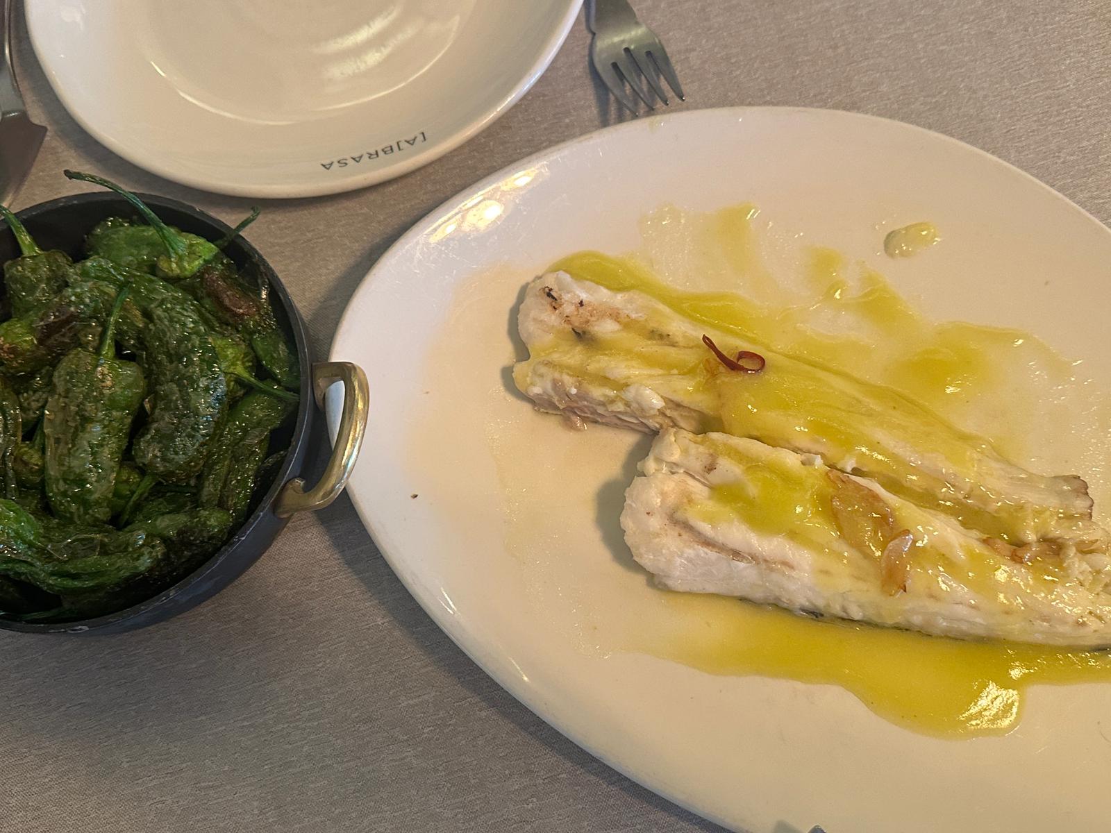 De esas lonjas te llegan a la mesa calamar de anzuelo a la brasa, los bocaditos de merluza rebozados o el tartar de atún aliñado con yema de huevo, soja y aceite de oliva. Más clásico el rape negro con su bilbaína estilo Orio, la lubina a la espalda con refrito o el rodaballo a la parrilla con bilbaína. De estos platos tradicionales de pescado y aprovechando el punto que le dan las brasas, saboreamos una muy buena y fresca merluza de pincho a la parrilla con refrito (27 €) que la acompañamos con pimientos de Padrón (4,50 €) que, en nuestro caso, no picó ninguno.