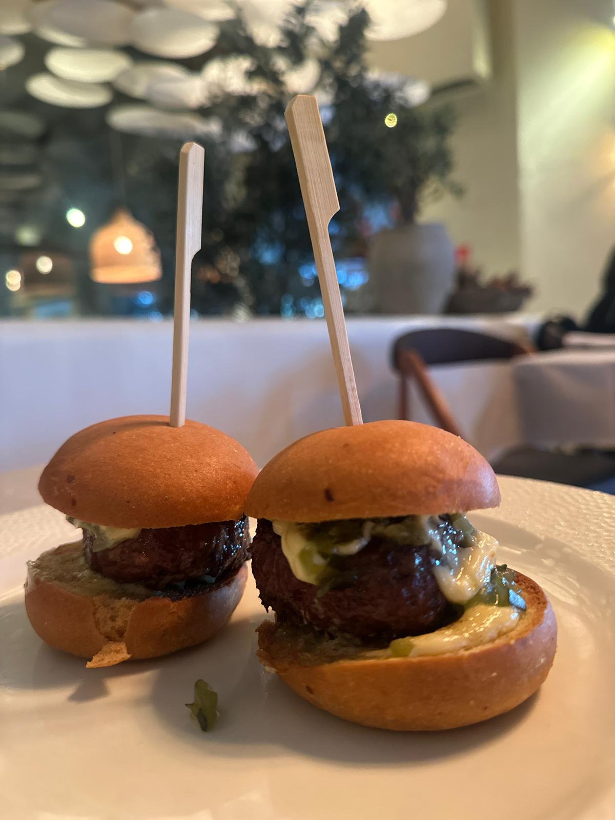 Para los carnívoros, opciones que van desde el pollito picantón asado al tomillo limonero al steak tartar clásico con pan tostado, pasando por las albóndigas de ternera y jamón ibérico estofadas o el solomillo de vaca salteado a la sartén con ajos confitados y romero. Si quieres parrilla, las chuletillas de cordero lechal al sarmiento, la pluma ibérica a la brasa o las mini hamburguesas de picaña madurada en pan brioche (18 € 2 unidades) con la "buena compañía" de patatas fritas (4,50 €).