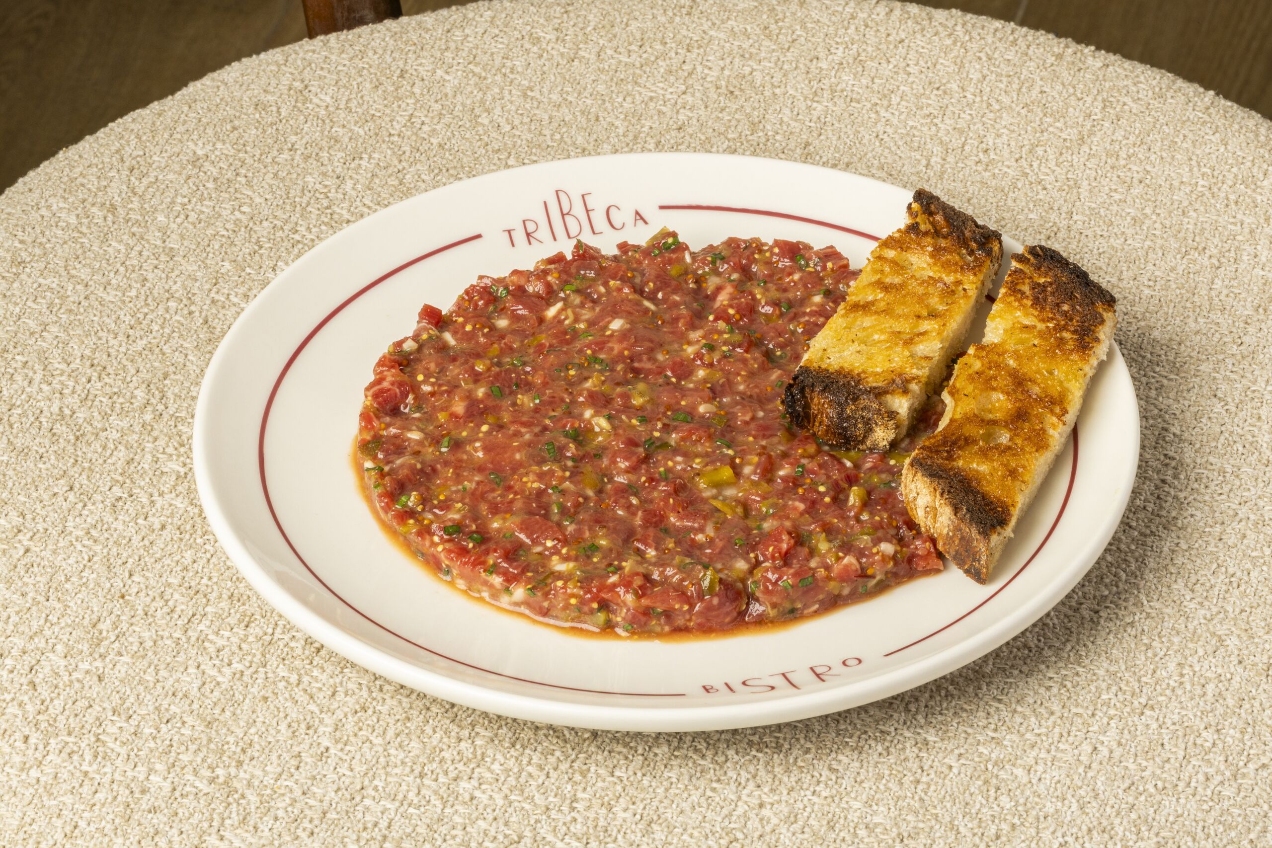 Y si quieres gozar del entrante que más éxito tiene en Tribeca Bistró no te pierdas su steak tartar clásico (24 €), preparado en mesa frente al comensal con chipotle, mostaza antigua y el secreto de la casa además de yema de huevo emulsionada para darle consistencia al plato. El punto del picante lo ponen con Tabasco al gusto del cliente.