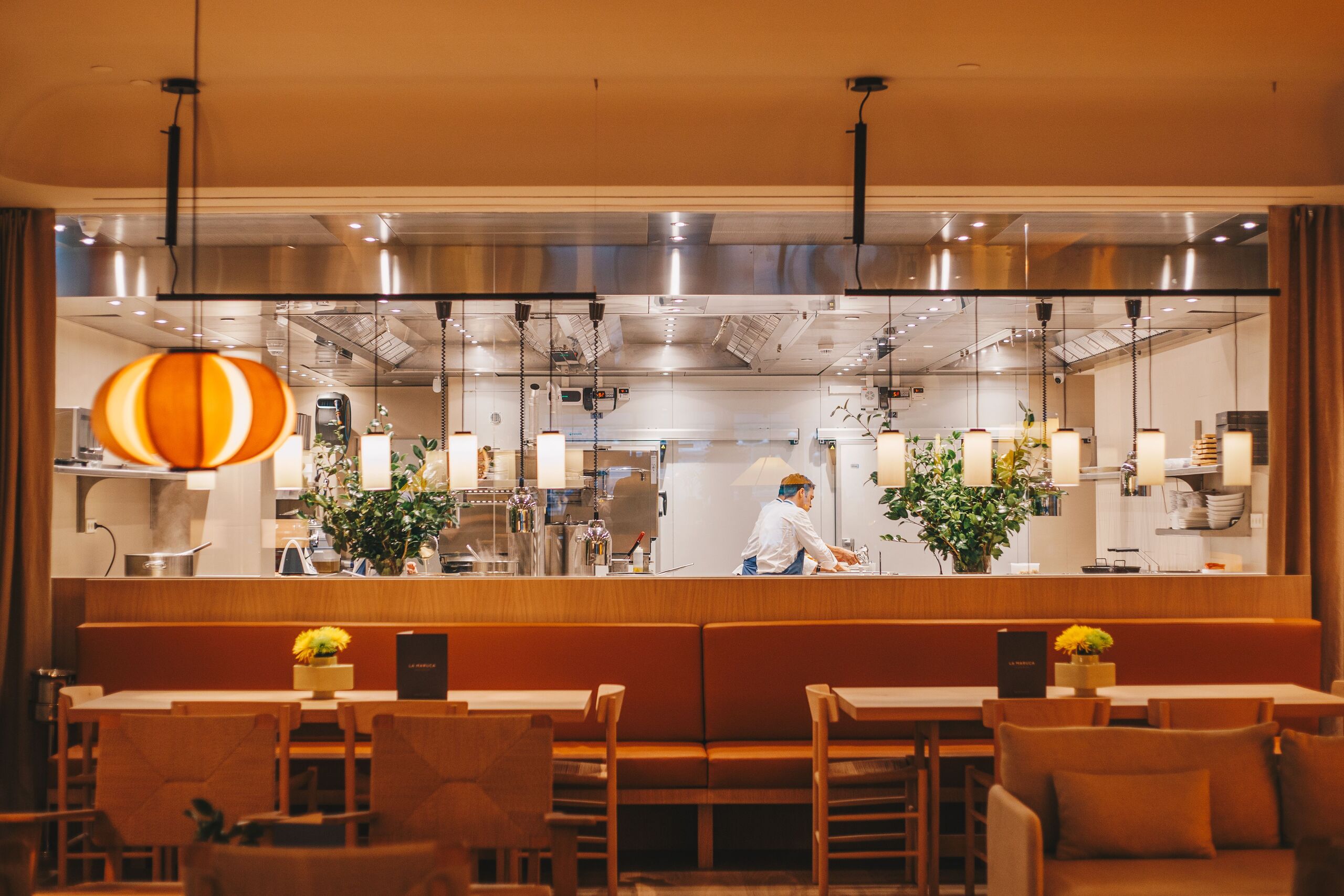 El local es amplio, luminoso y extremadamente versátil. Cuenta con una imponente barra para el picoteo rápido o el afterwork, un salón acogedor con cocina vista —que aporta esa calidez doméstica tan propia del grupo— y una terraza exterior bajo el porche del edificio con capacidad para 50 comensales, ideal para disfrutar de la zona financiera con un punto de calma.