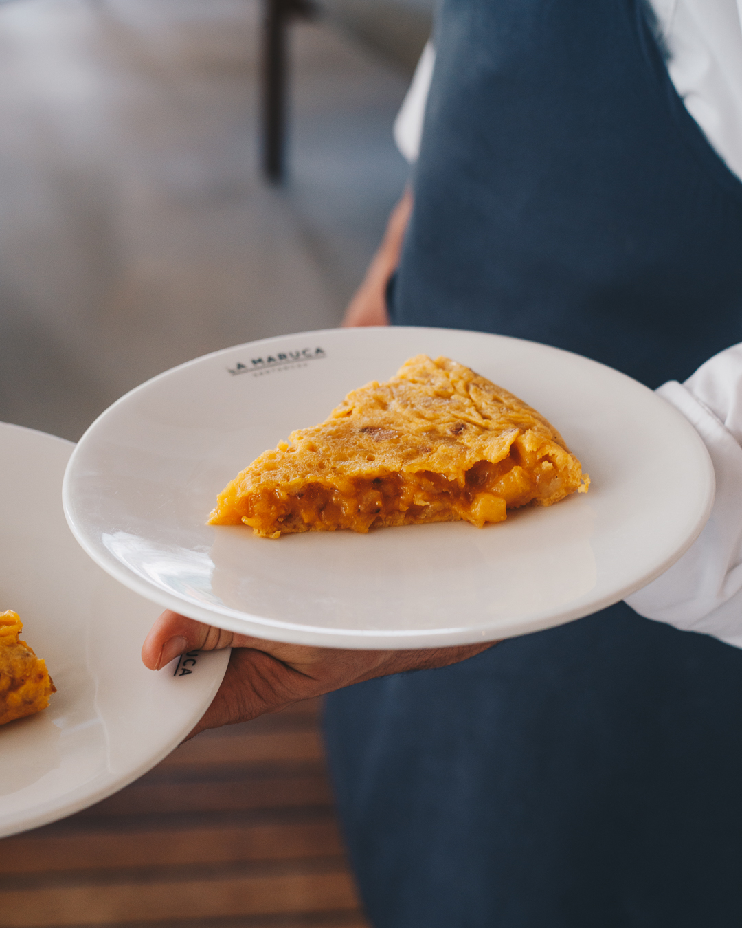 La filosofía de La Maruca se mantiene intacta en Azca: una casa de comidas moderna con horario ininterrumpido. El día comienza a las ocho de la mañana con uno de los rituales más sagrados de la capital: el pincho de tortilla de Cañadío, una obra de arte de la técnica poco cuajada con todo el sabor de este platazo que también se puede disfrutar a cualquier hora del día y que comparte protagonismo con bizcochos artesanos y tostadas.