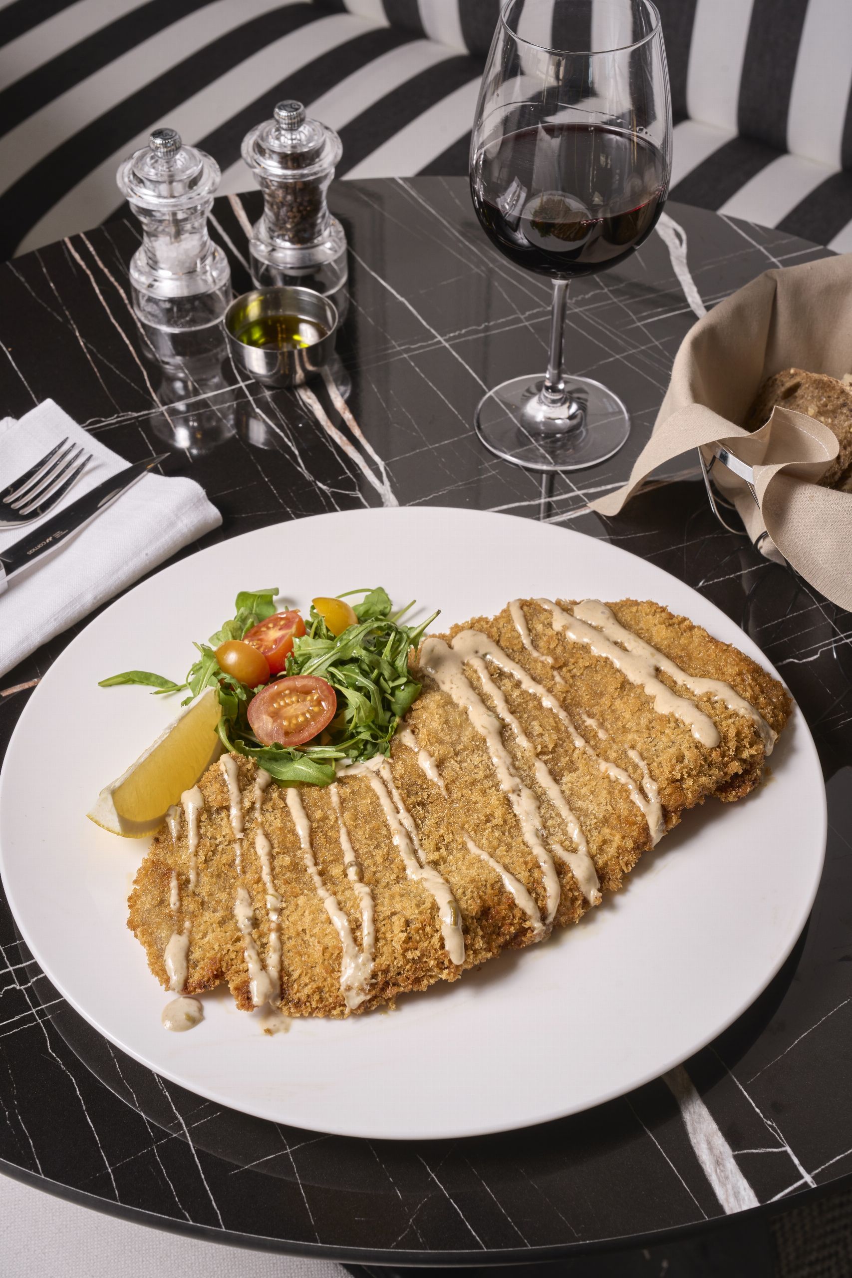 Para quienes buscan una comida más estructurada, los platos principales mantienen ese equilibrio entre sencillez y sofisticación. Desde los tagliatelle con ragout clásico hasta la lubina con mantequilla y alcaparras. La brasa también cobra protagonismo con el coquelet con pesto mediterráneo, aportando ese sabor rústico y auténtico que tanto se agradece en la mesa. Tampoco te puedes perder el escalope alla viennese de ternera con salsa tonnata (22 €), bastante abundante así que mejor compartirlo entre varios, con un rebozado crujiente y una salsa al estilo del plato típico italiano y que te recomiendo pedirla aparte para que cada bocado tenga el punto que quieras.