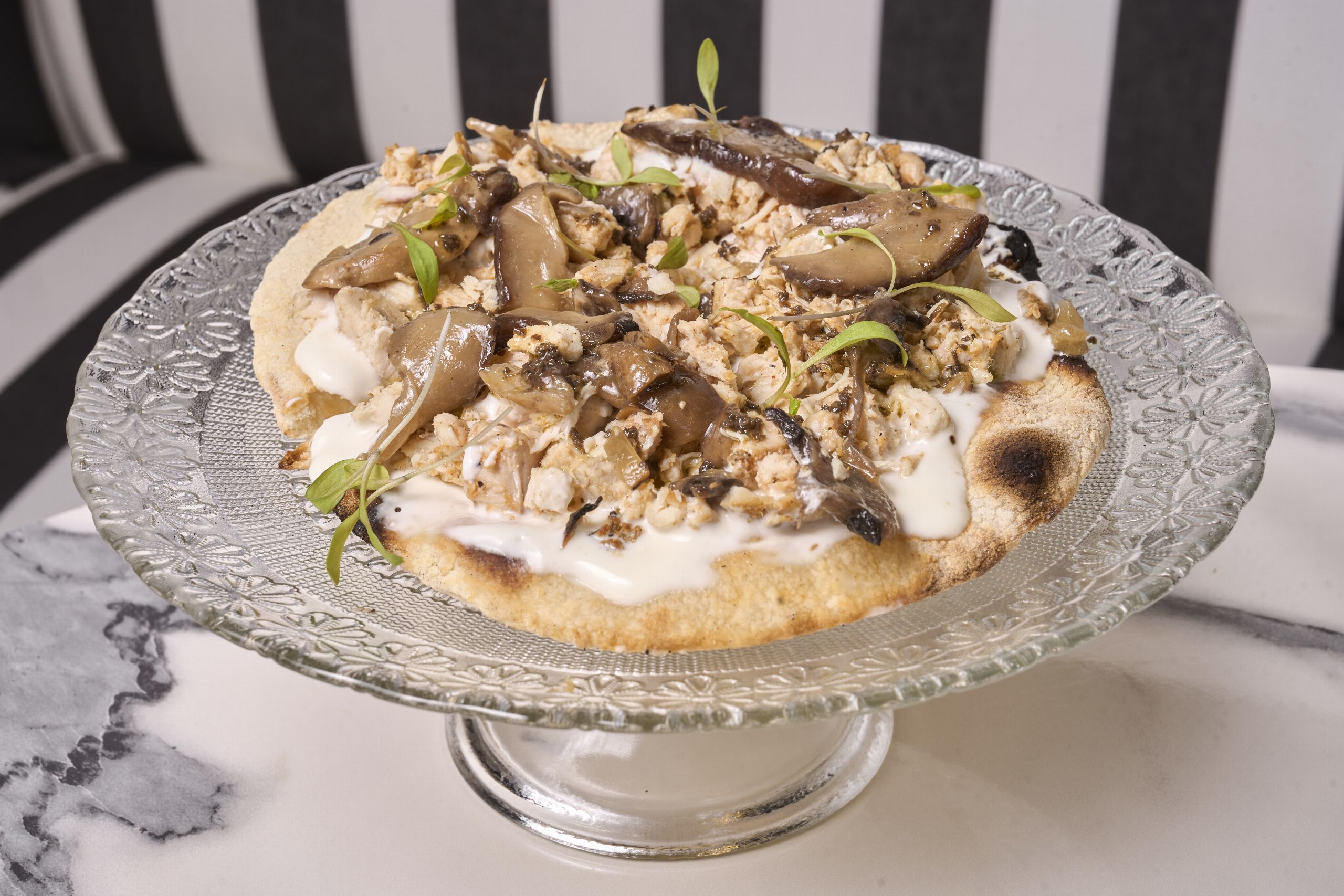 En ese afán por elaborar platos para compartir, también para los más pequeños, Giardino ha pensado en ofrecer una pequeña selección de pizzetas artesanas, perfectas para dos o cuatro personas. De chorizo picante, miel de flores y scamorza; de salmón ahumado, queso crema y eneldo o la que pedimos nosotros, la pizzeta artesana de pollo asado y boletus (16 €). Con una masa fina crujiente y un relleno espectacular, porque sí, como te contaré más adelante el pollo asado es uno de los reclamos, tanto de Giardino como de su tienda gourmet Del Amo, situada a pocos metros.