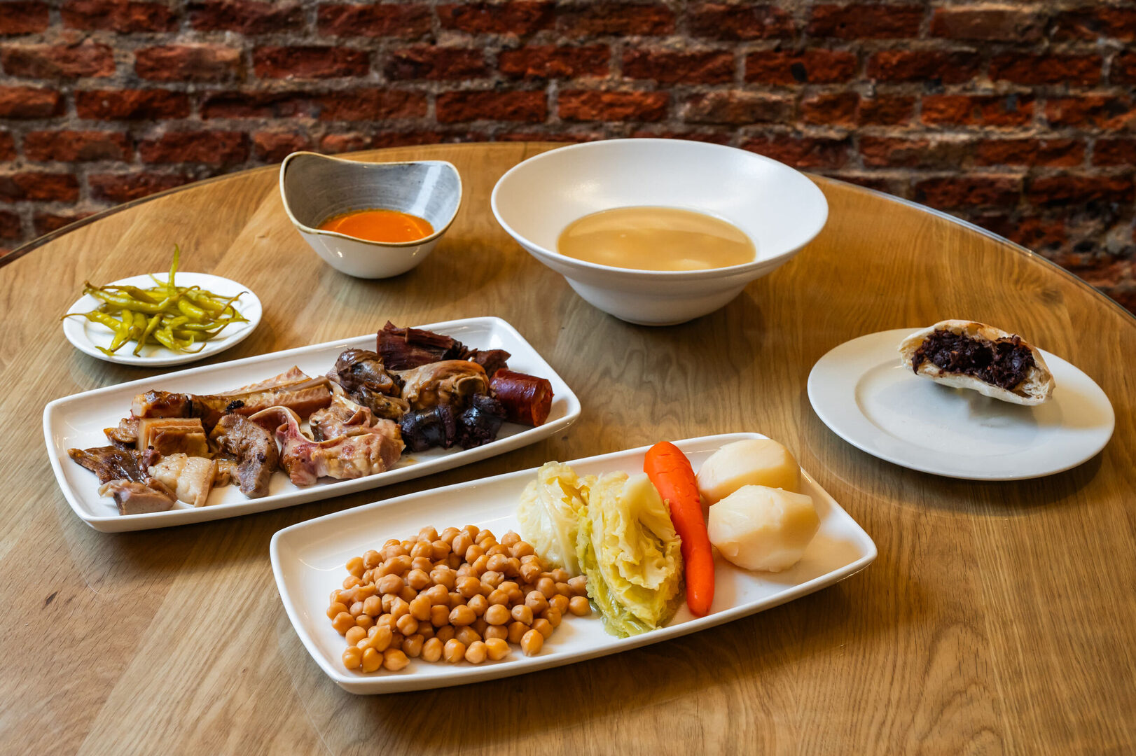 A partir de ahí, el despliegue es canónico. Un primer vuelco con una sopa desgrasada y profunda, que llega a la mesa escoltada por cebolletas y piparras. El segundo vuelco da paso a los garbanzos, tiernos y mantecosos, servidos con la verdura y una salsa de tomate con cominos y AOVE. Para terminar, el tercer vuelco, un festival de carnes y chacinas donde destaca la calidad de proveedores como Urbano de Frutos o Cárnicas LyO.