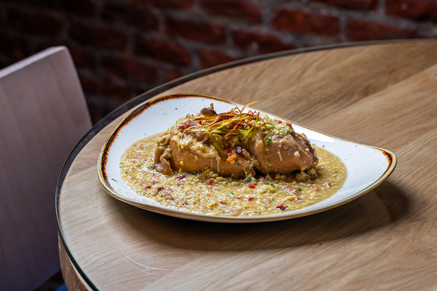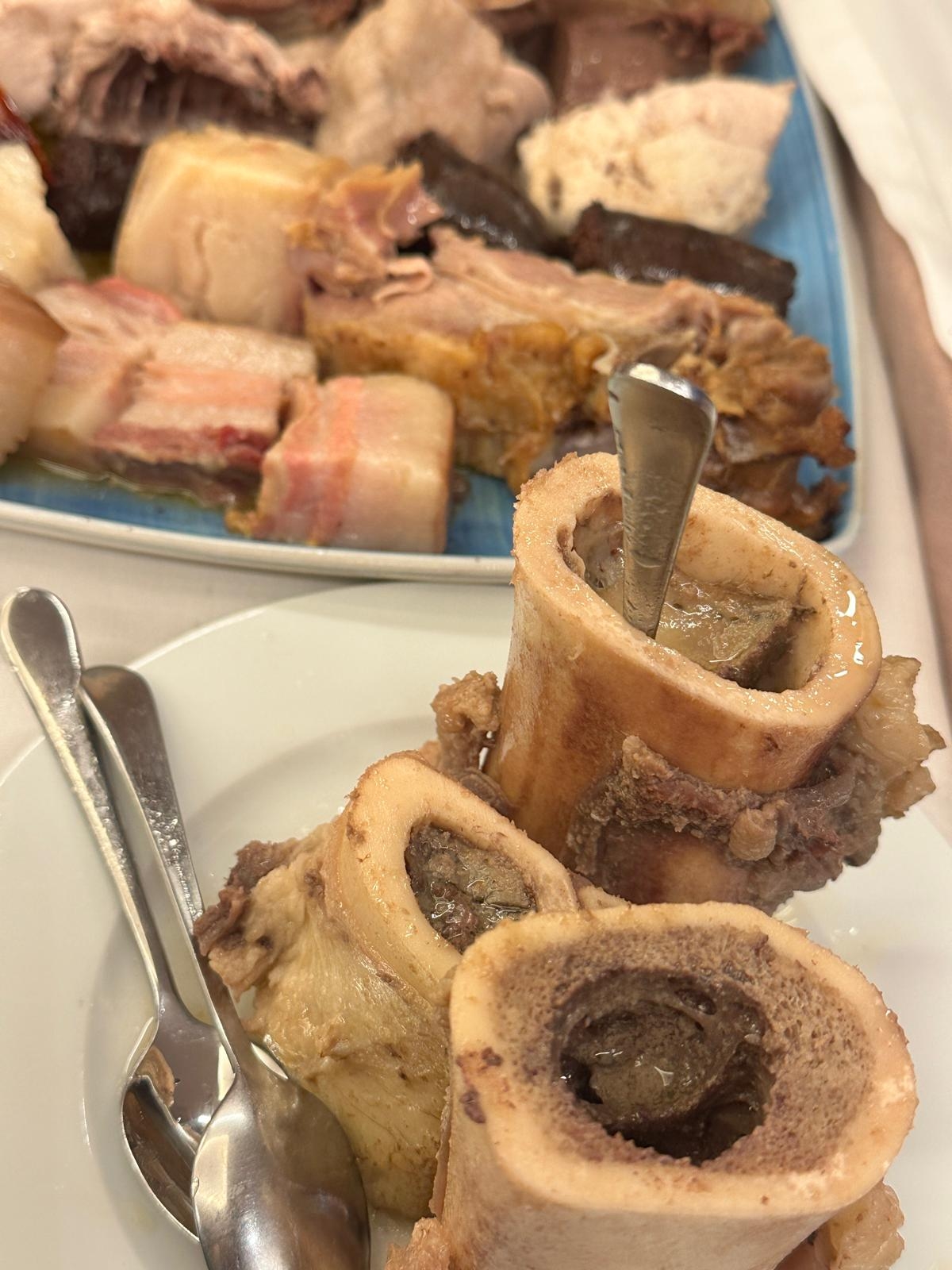 En cuanto a la carne de cerdo, utilizan un cerdo salado que les manda la empresa gallega Jamones Macadio. Además, te encuentras con la oreja, el morro, la careta y el espinazo. No es de extrañar que para desengrasar incluyan una ensalada de escarola con granada y naranja.