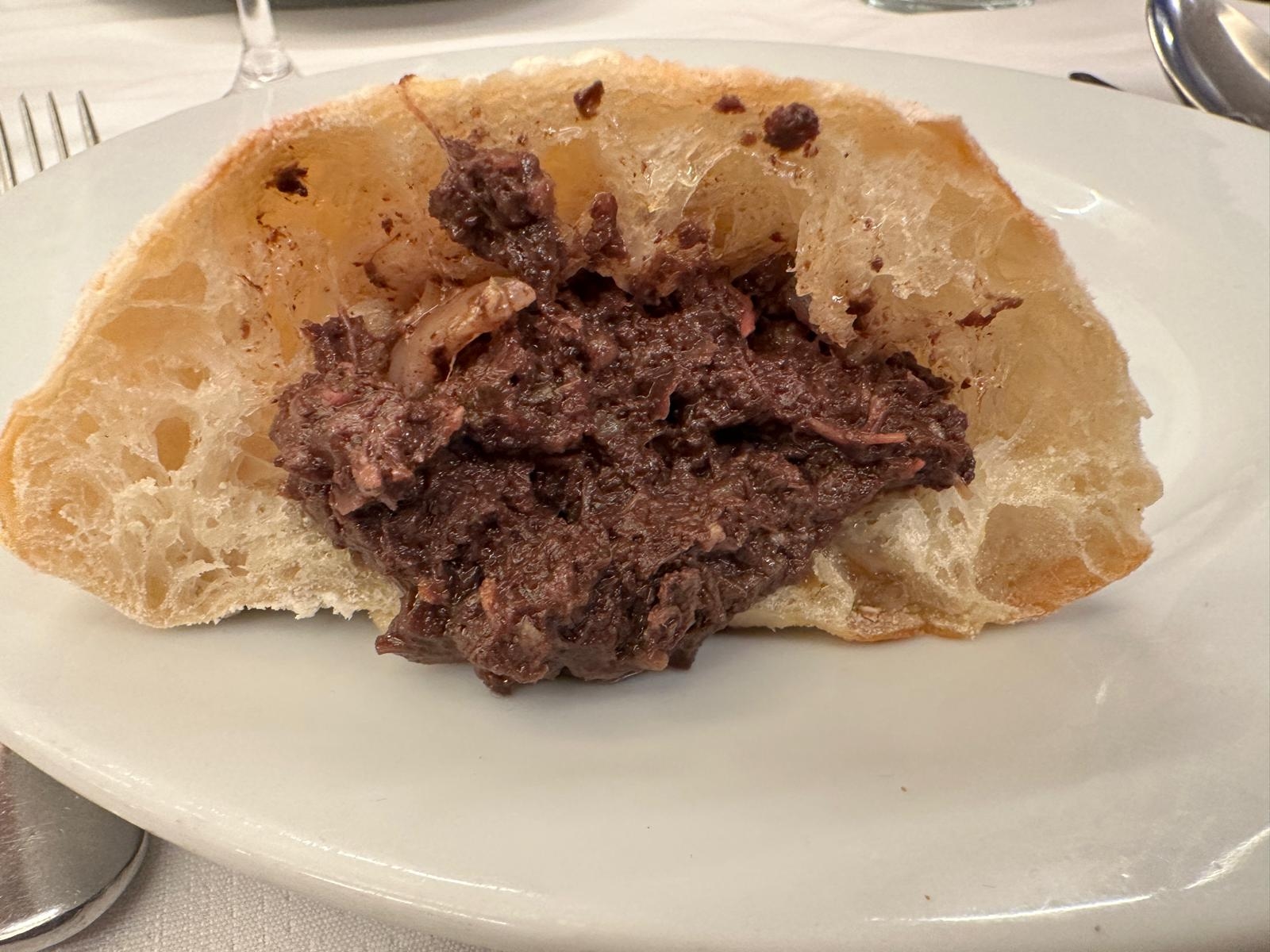 La experiencia en Ponzano 12 comienza con un guiño a sus orígenes charcuteros: un mollete caliente con pringá que prepara el estómago para lo que viene, elaborado con pan de cristal de Viena la Baguette y rellena con la morcilla de puerro del País Vasco que preparan para el cocido.