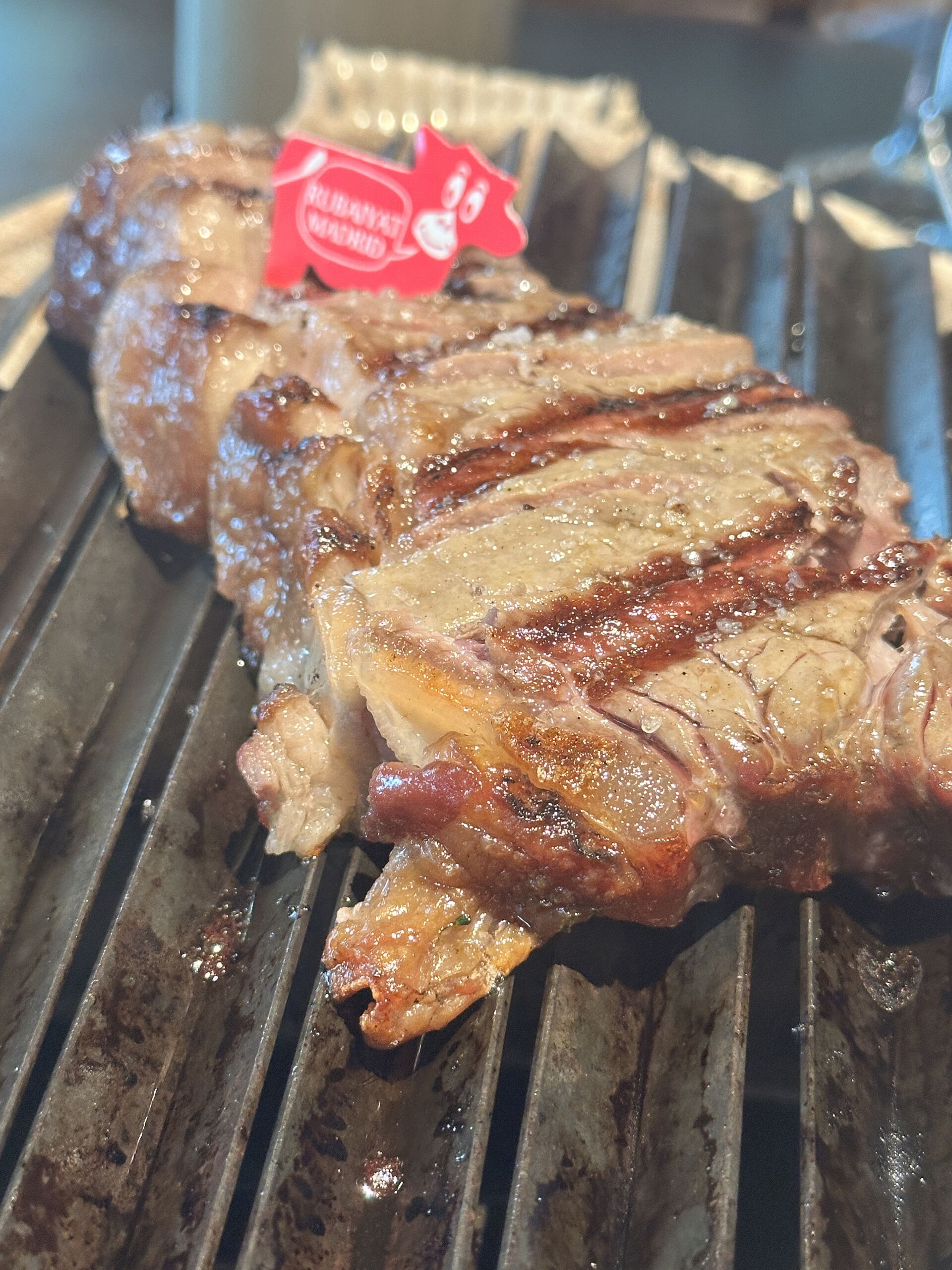 Aconsejados por el atento servicio de sala probamos un extraordinario bife de chorizo Angus (38 €), con un gran sabor propio de este animal tan cotizado, el punto perfecto de la carne, el toque de la brasa y un cuchillo que desliza de maravilla para que esa tierna pieza, que se puede comprar en la tienda que se encuentra dentro del restaurante.