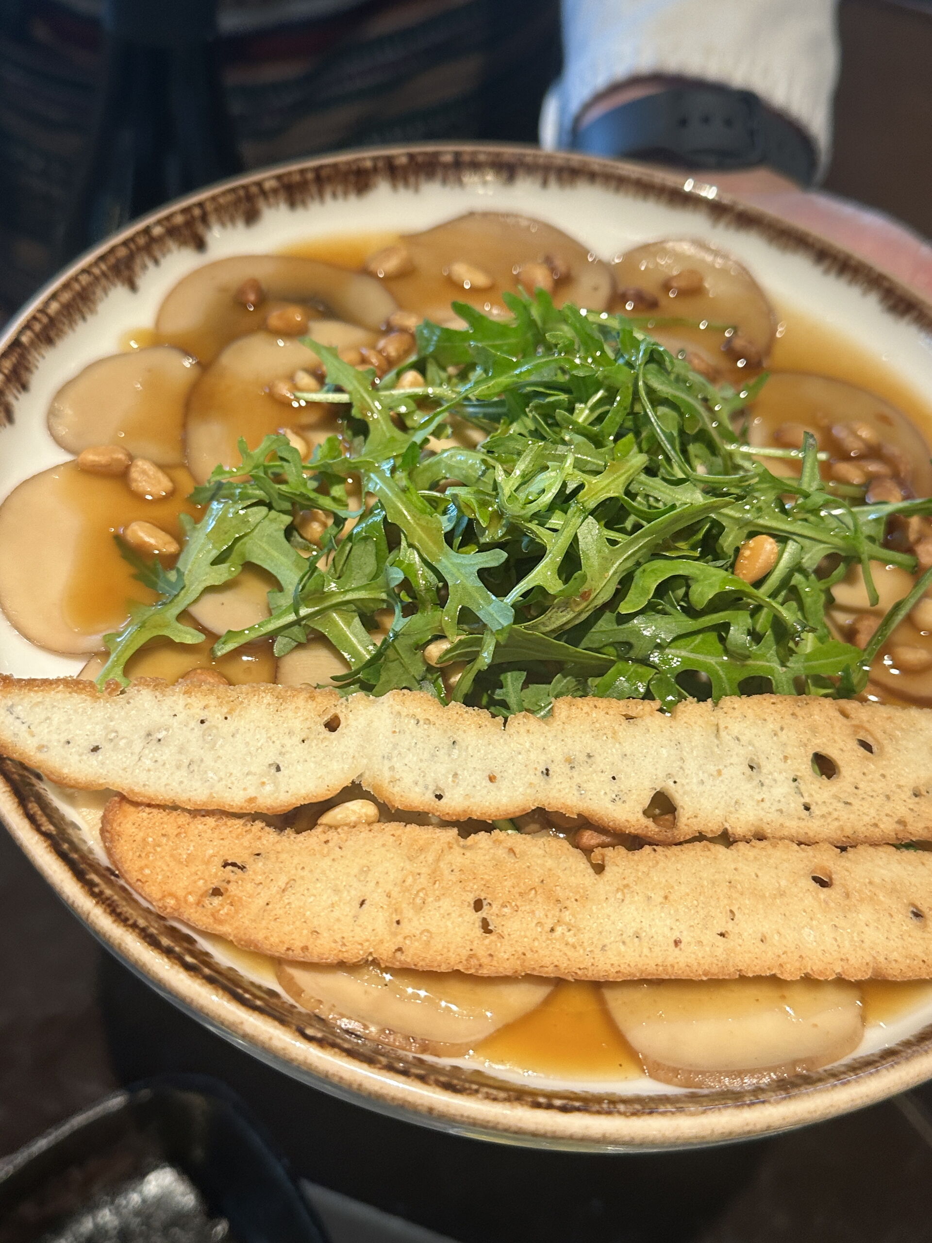 De esos entrantes también te recomiendo el carpaccio de setas Portobello infusionado en AOVE y trufas (14,90 €) coronado con piñones, un plato con sabor y lleno de matices para seguir disfrutando de la carta de vinos que también destaca en esta casa. Eso sí, si eres de los clásicos, prueba su jamón ibérico de bellota 100% Joselito corte fino o la cecina de Wagyu ligeramente ahumada y curada 48 meses. Todo regado por un muy buen vino tinto Paraje de los Vidrios, elaborado por el enólogo Manuel Manzaneque Suárez para la bodega homónima con variedad 100 % Garnacha tinta bajo la DO Vinos de Madrid.