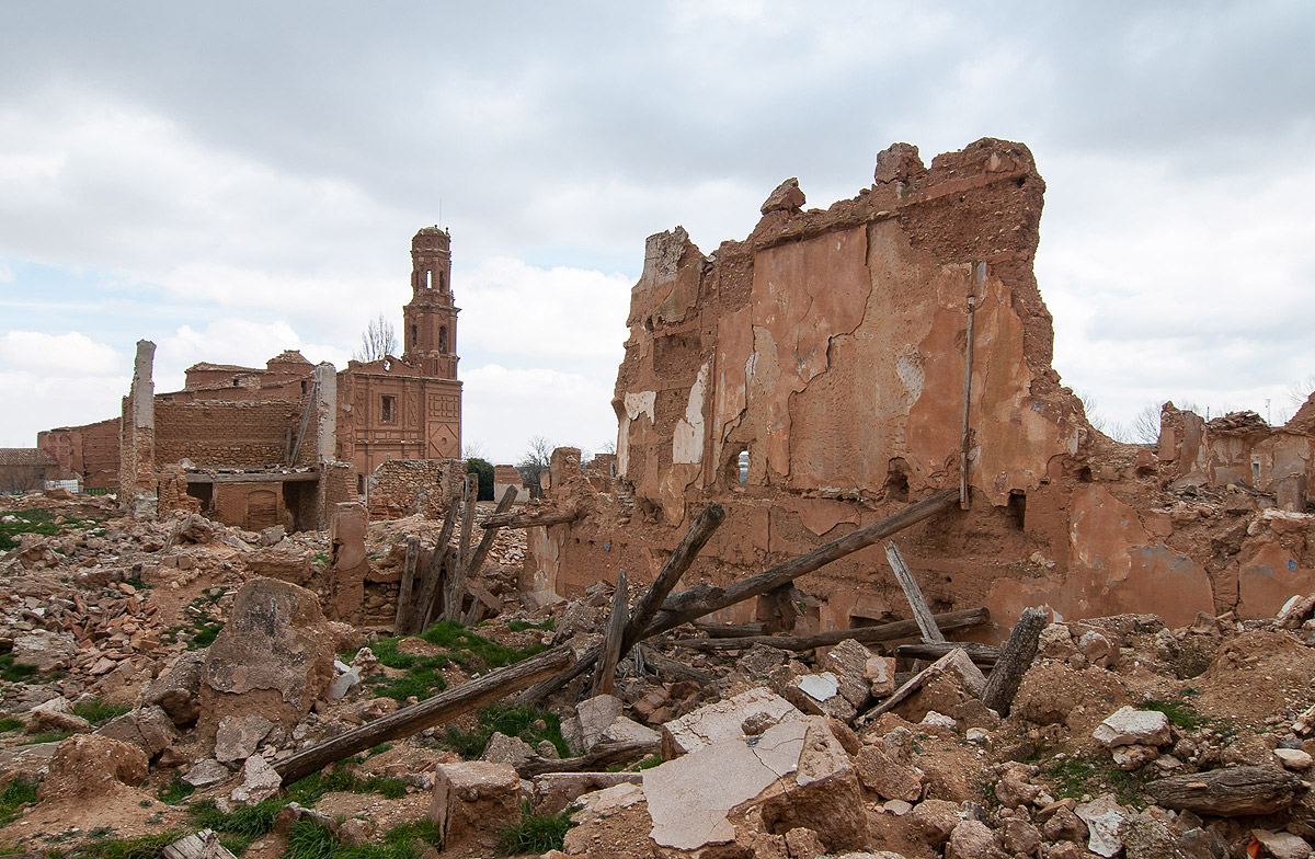 El tamaño de Belchite y su ubicación en el mapa hacían que en muchas partes del pueblo no se viese nada que no fuesen casas destrozadas, muros caídos y cascotes, muchos cascotes, jalonando nuestro camino aquí y allá, siendo el único testimonio de lo que fue una casa o saliendo por la puerta de madera de una vivienda, como si el edificio hubiese colapsado ayer y no hace 75 años.