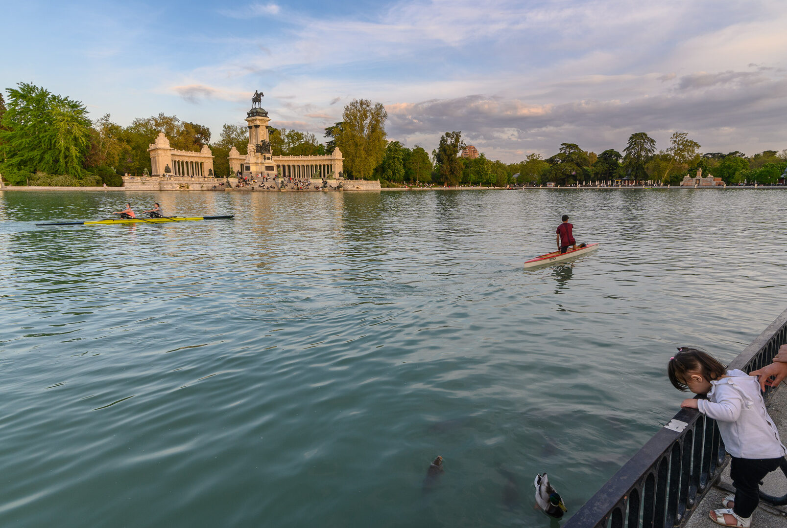 El Retiro es el frescor de sus cercanías en verano y el reloj que mide el paso de las estaciones, pero también sus monumentos pequeños o no tan pequeños, las muchas estatuas, el Palacio de Cristal con su arquitectura delicada y trasparente, el monumento a Alfonso XII y su grandeza un poco impostada, puede, pero que tan elegante queda al reflejarse sobre el estanque. Sobre todo, créanme porque lo he visto, en esas tardes de otoño o primavera cuando monumento y reflejos son bañados por la luz de los maravillosos atardeceres de Madrid, cuando el sol a punto de morir hace explotar a este Paisaje de Luz en un dorado que lo hace aún más radiante, si es que eso es posible.