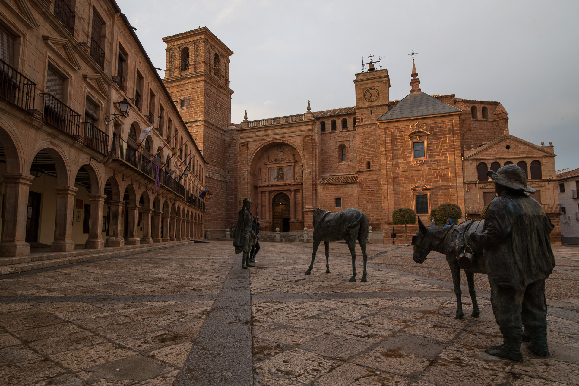 La iglesia, por cierto, da su mejor fachada a la preciosa plaza mayor de la villa, desde la que unas curiosas estatuas de don Quijote, Sancho y sus respectivas cabalgaduras nos saludan a tamaño natural y de una forma bastante original. Como original es también la propia plaza, irregular en su trazado -sobre todo porque la iglesia parece invadirla- y diferentes los edificios que la forman, pero logrando ser un conjunto armonioso, sobre todo por la fachada neoclásica del Ayuntamiento y los edificios anexos, edificados en una cálida piedra vista.